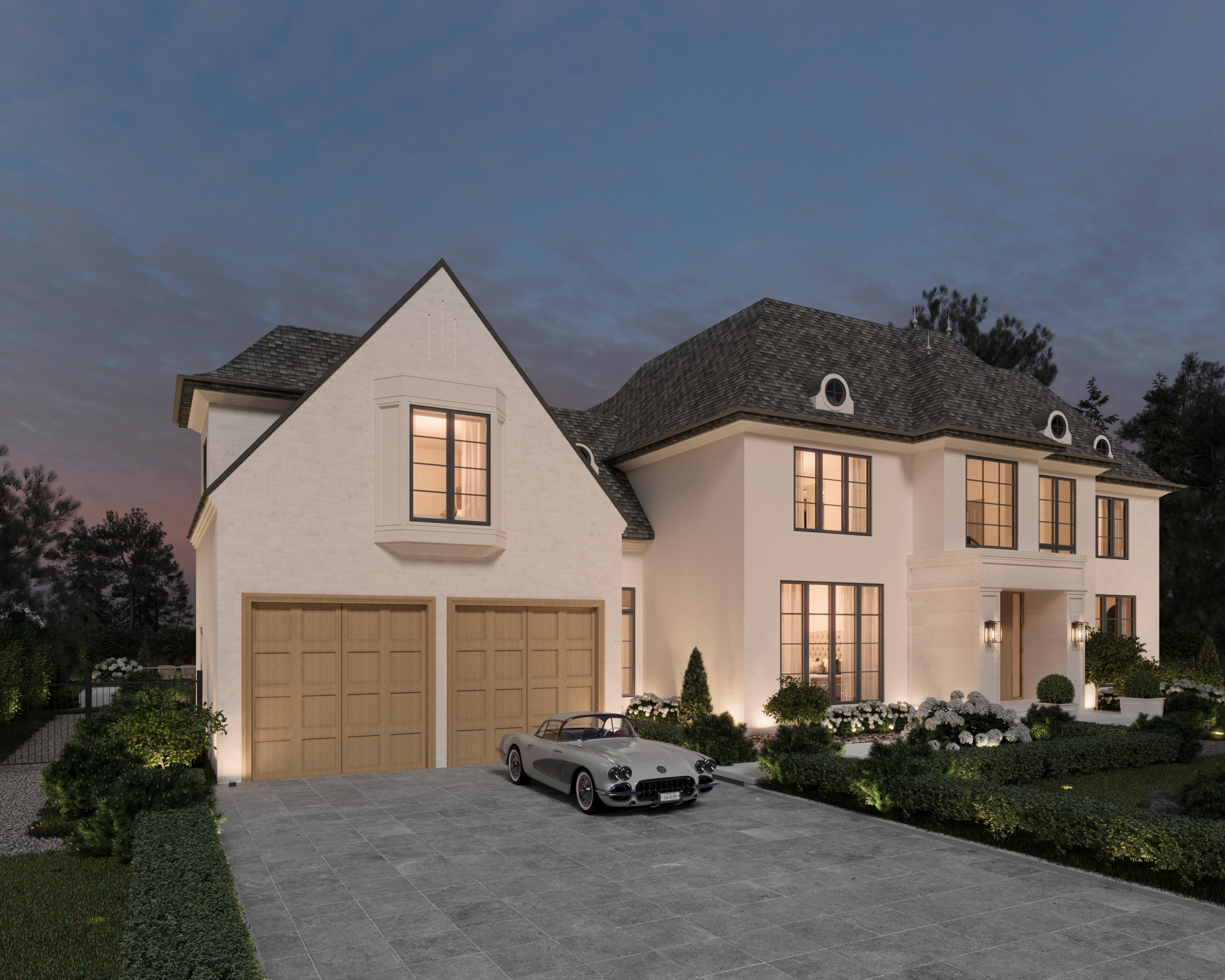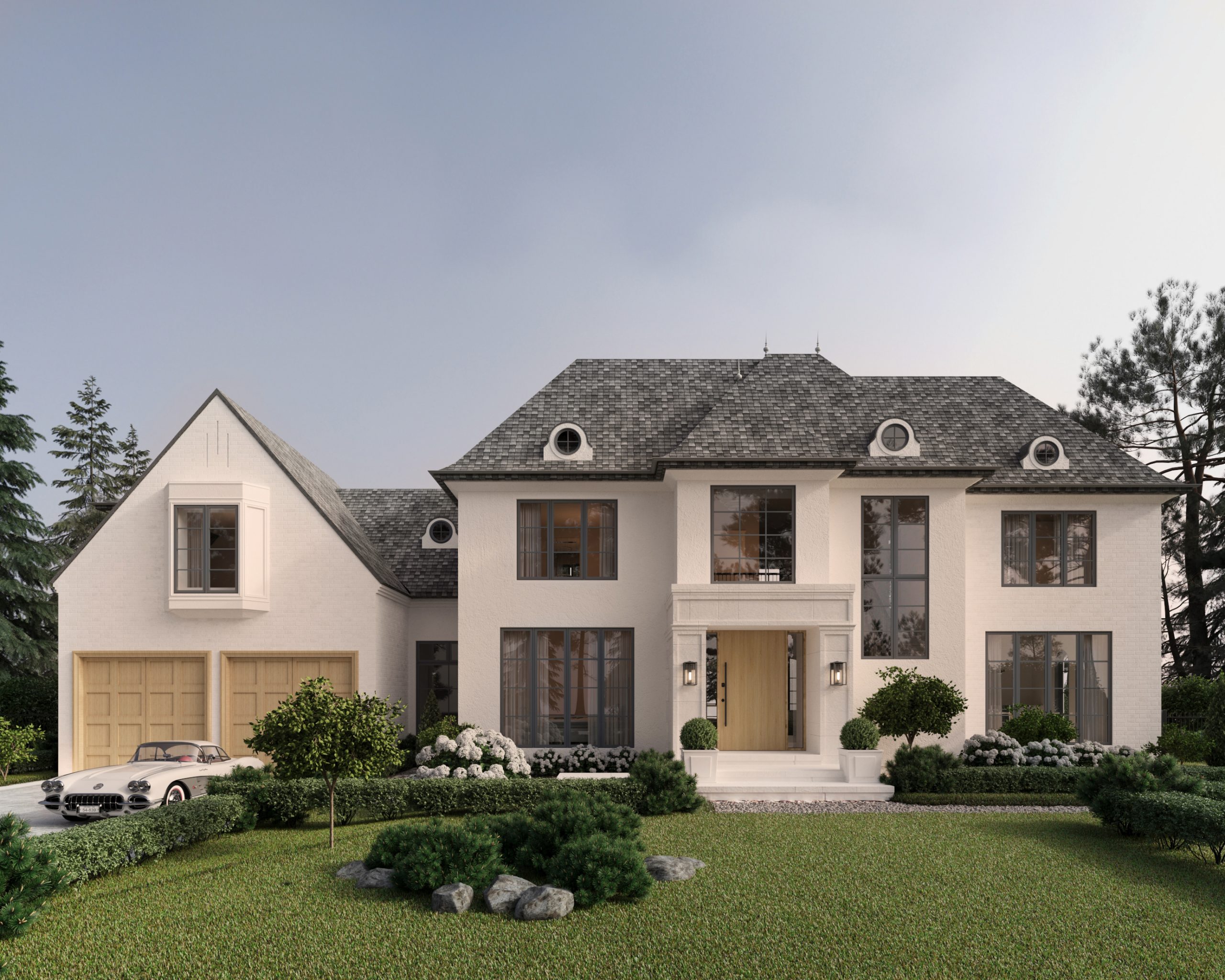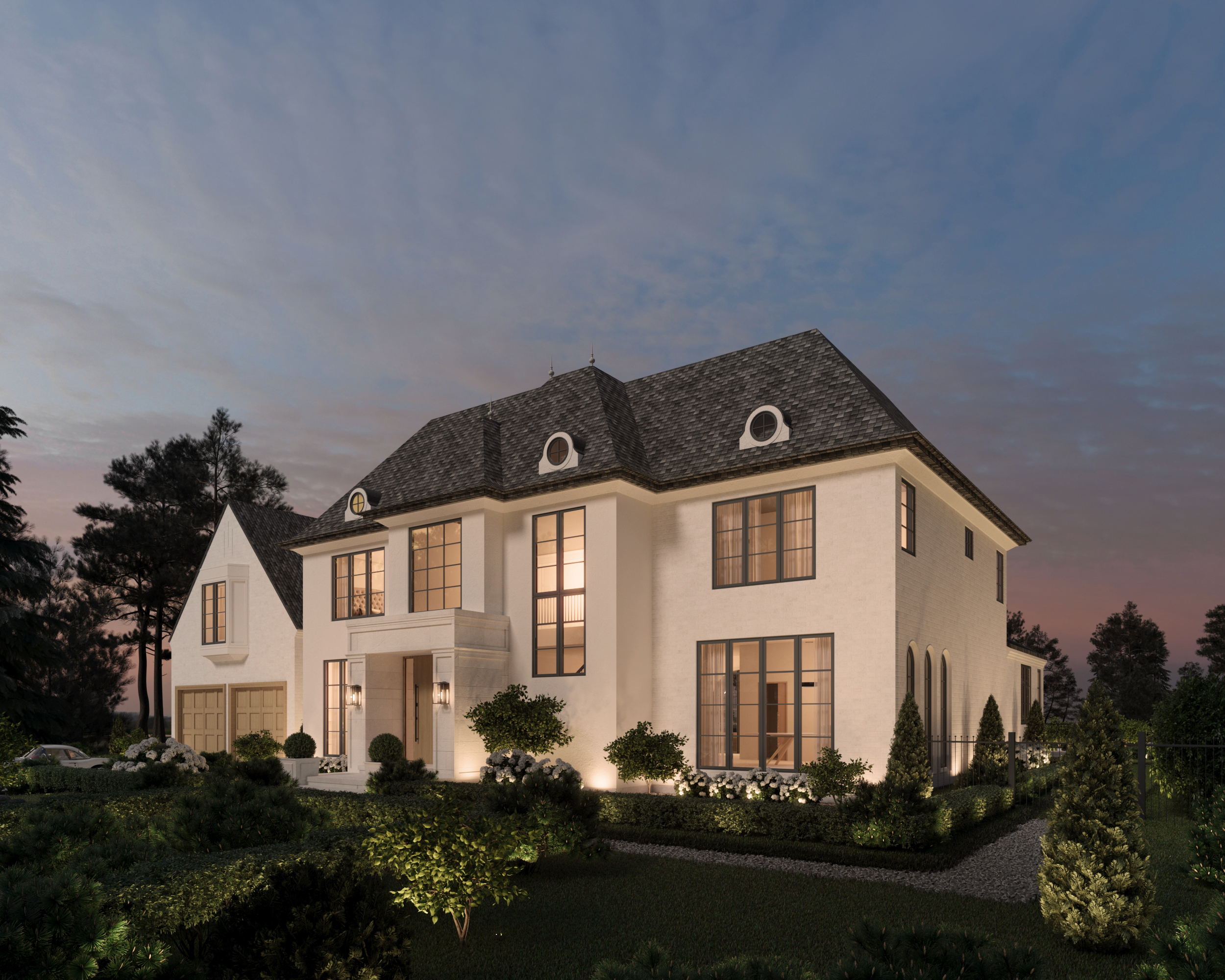 The left side of the home showcases the double garage, defined by its clean white oak doors which introduce warmth to an otherwise neutral façade. The elevation itself is composed of a mix of limewashed brick, subtle micro-cement plaster, and select stonework all in a cohesive palette of beige, limewashed off-white, and soft greys. Above the garage, a charming bay window projects gently, adding rhythm to the structure. A gravel path runs along the edge, leading discreetly to the rear of the property.