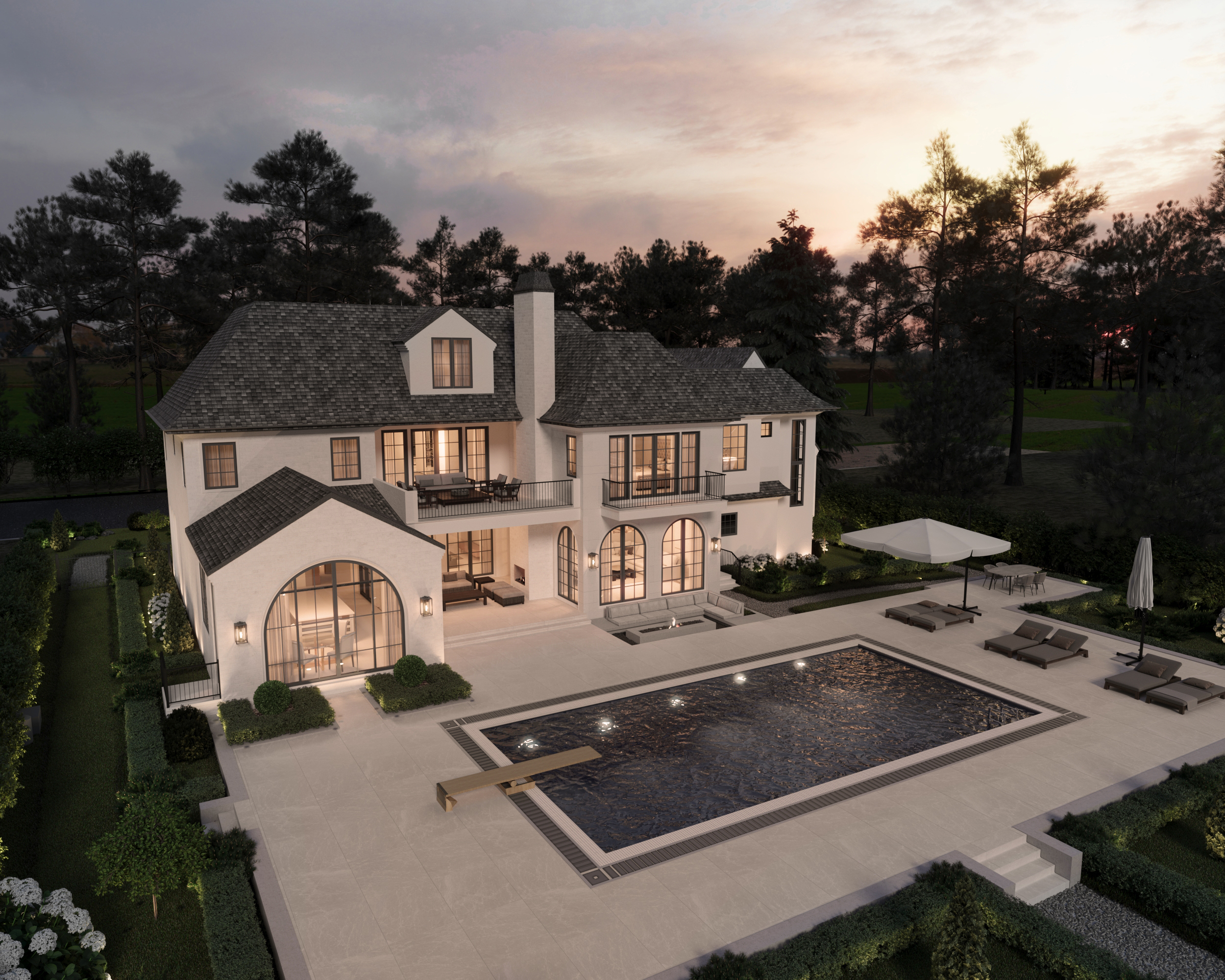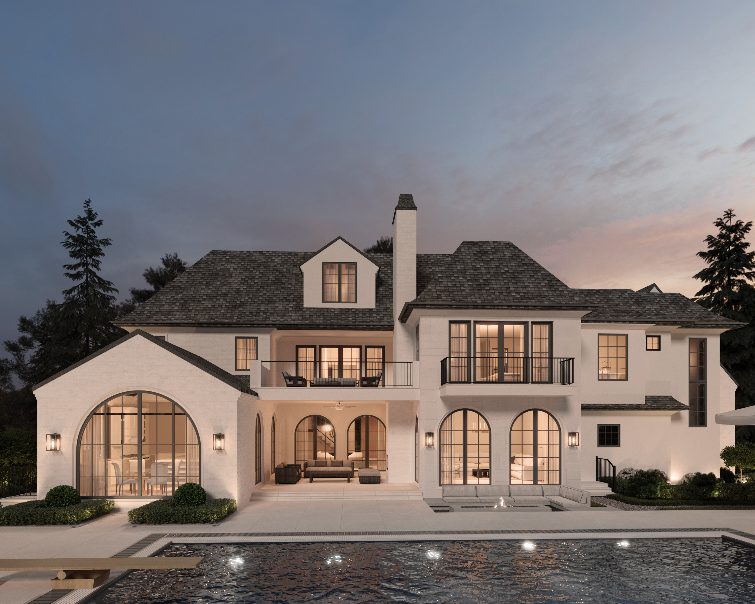 At the rear, the design opens up into a space for both hosting and everyday ease. A series of arched windows introduces a classical softness to the otherwise clean-lined structure, with the largest arch offering a dramatic focal point that frames the indoor dining area. A covered terrace hosts a lounge zone adjacent to the pool, and a more intimate patio with a built-in fireplace is set just off to the side ideal for cooler evenings. The materials remain consistent throughout, creating a seamless flow from front to back.