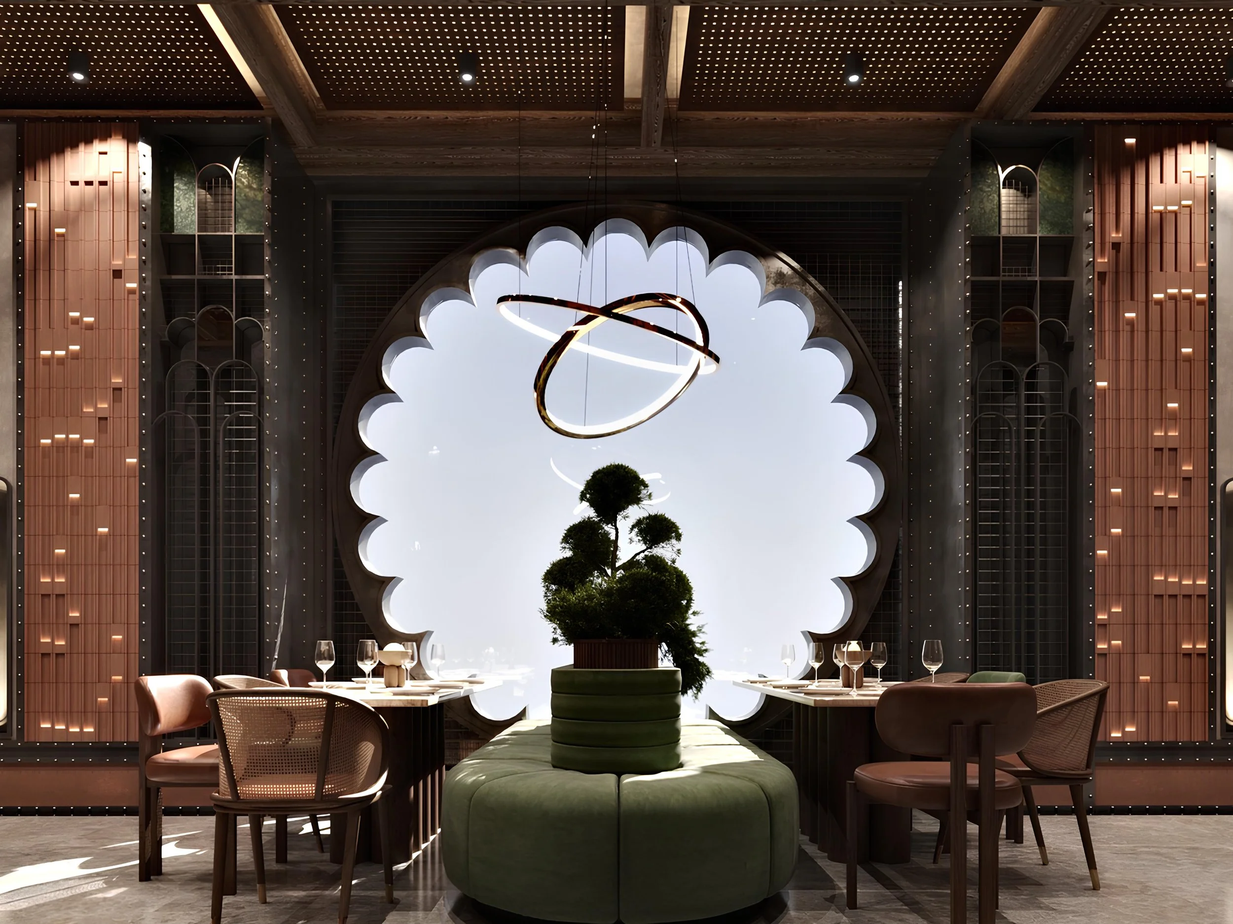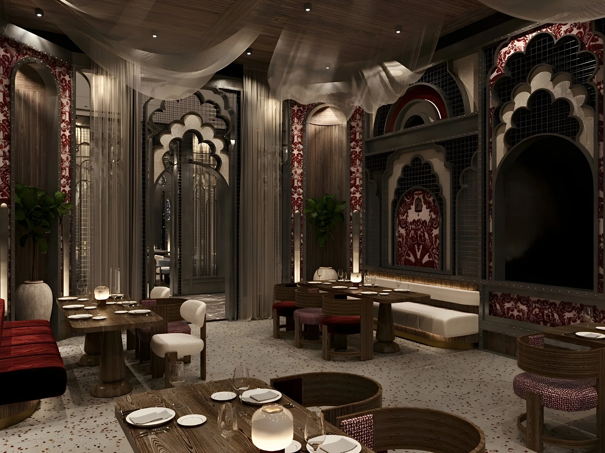 Light filters through arched geometries, playfully echoed in wall carvings and custom lighting, while the room’s generous scale allows for an airy, communal rhythm. This is not simply a dining space it’s a theatrical setting designed to celebrate movement, tradition, and ritual. The spatial clarity allows each detail to be appreciated, from textured acoustic panels to the subtle shift in tone across surfaces, all framed within a softly lit atmosphere that evokes Mediterranean hospitality.