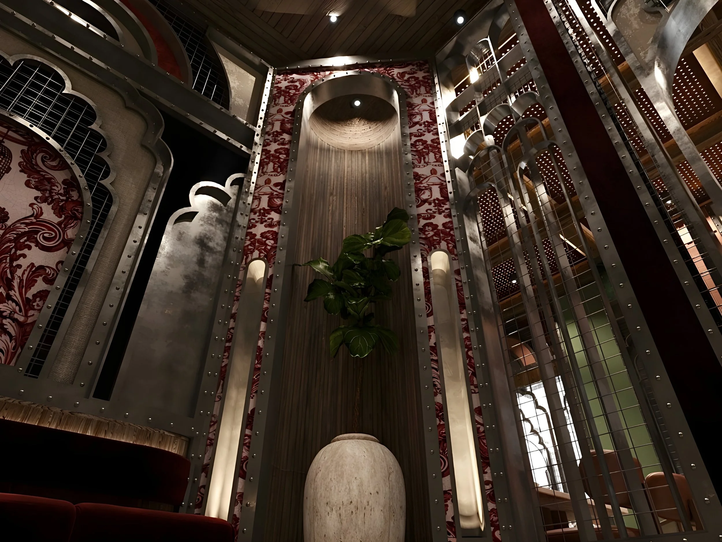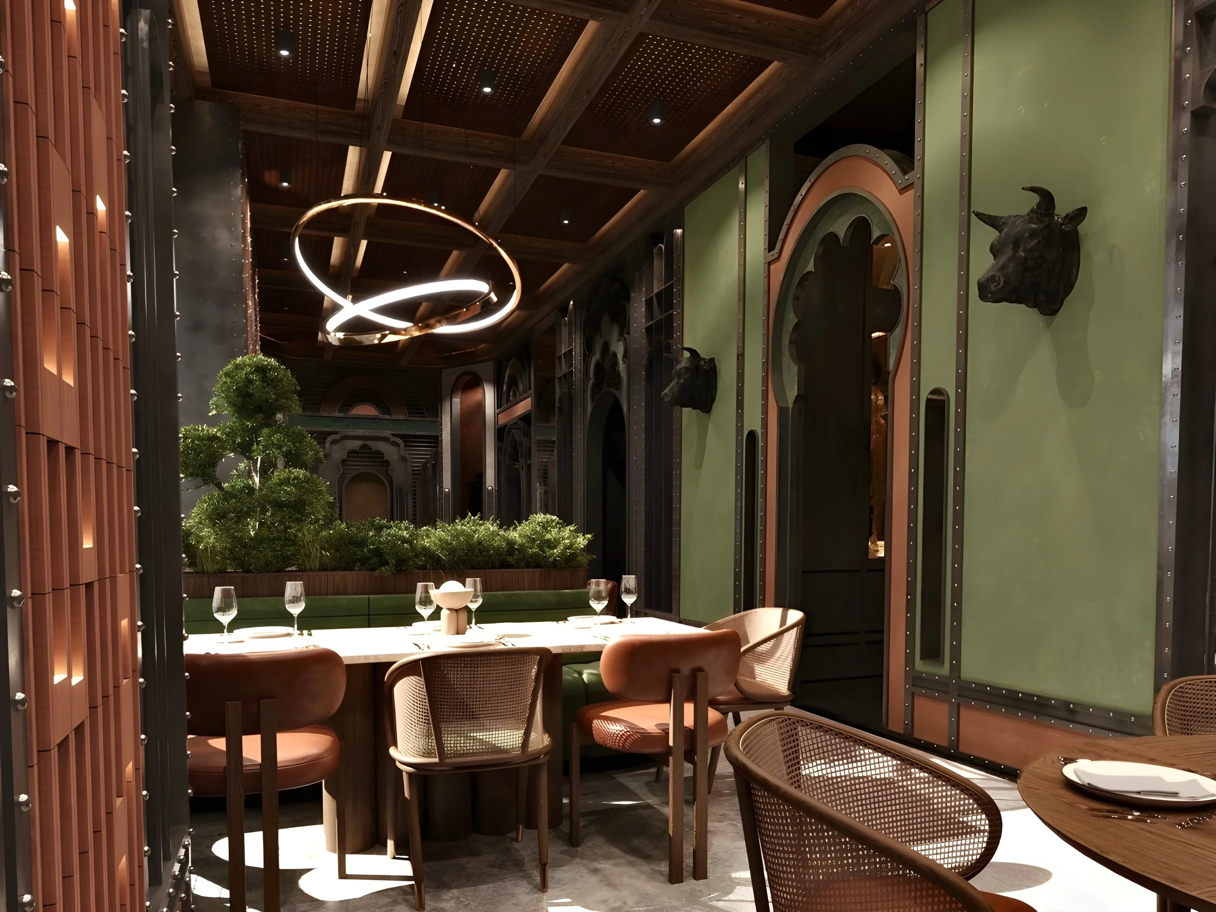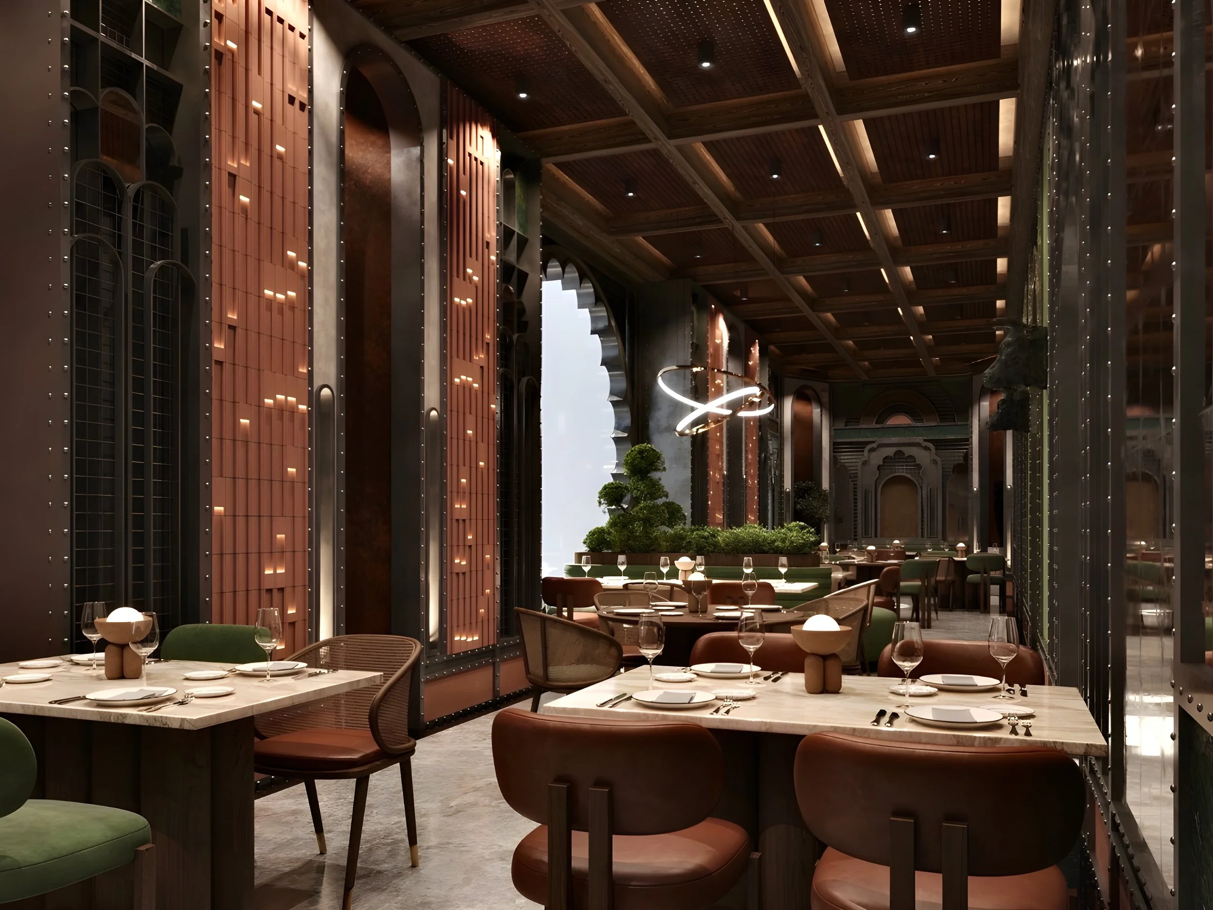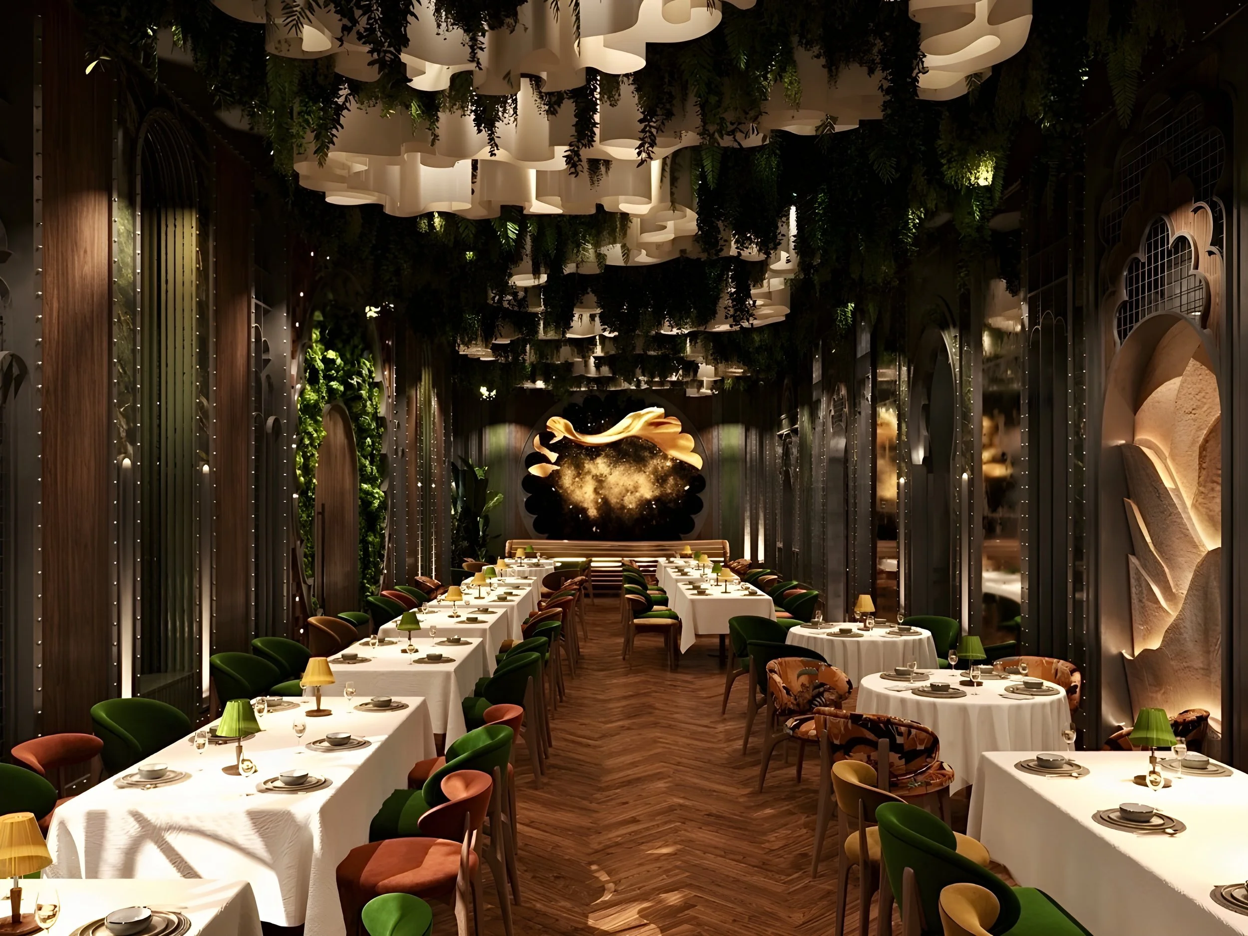 The Latin American room is the most vibrant and immersive zone within the restaurant a spatial tribute to the raw energy and biodiversity of the Amazon. The ceiling plays the leading role in setting the tone: dense greenery cascades along the edges, evoking jungle canopies, while the centreline remains open, symbolizing the Amazon River cutting through the forest. Every element has been designed to transport the visitor into a tropical setting warm timber tones, organic textures, and saturated colours bring to life the intensity and emotion of Latin culture. The lighting is deliberately theatrical, highlighting lush surfaces and reinforcing the feeling of being under a living canopy.