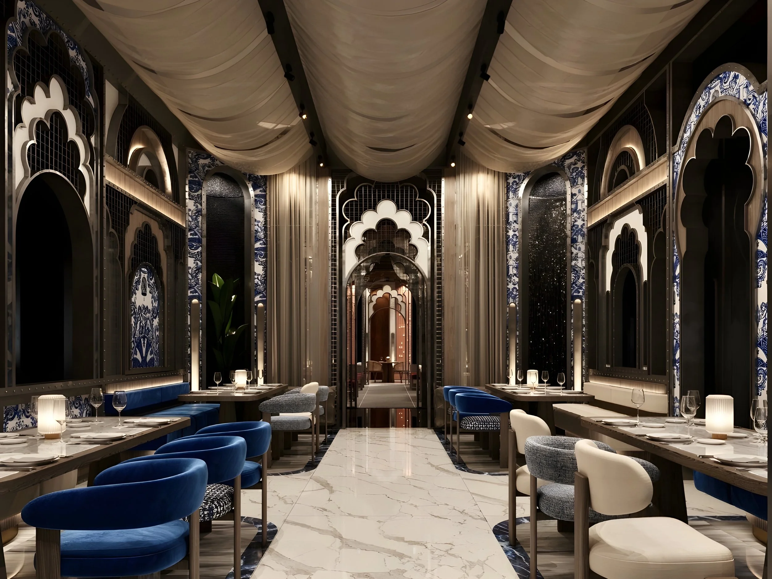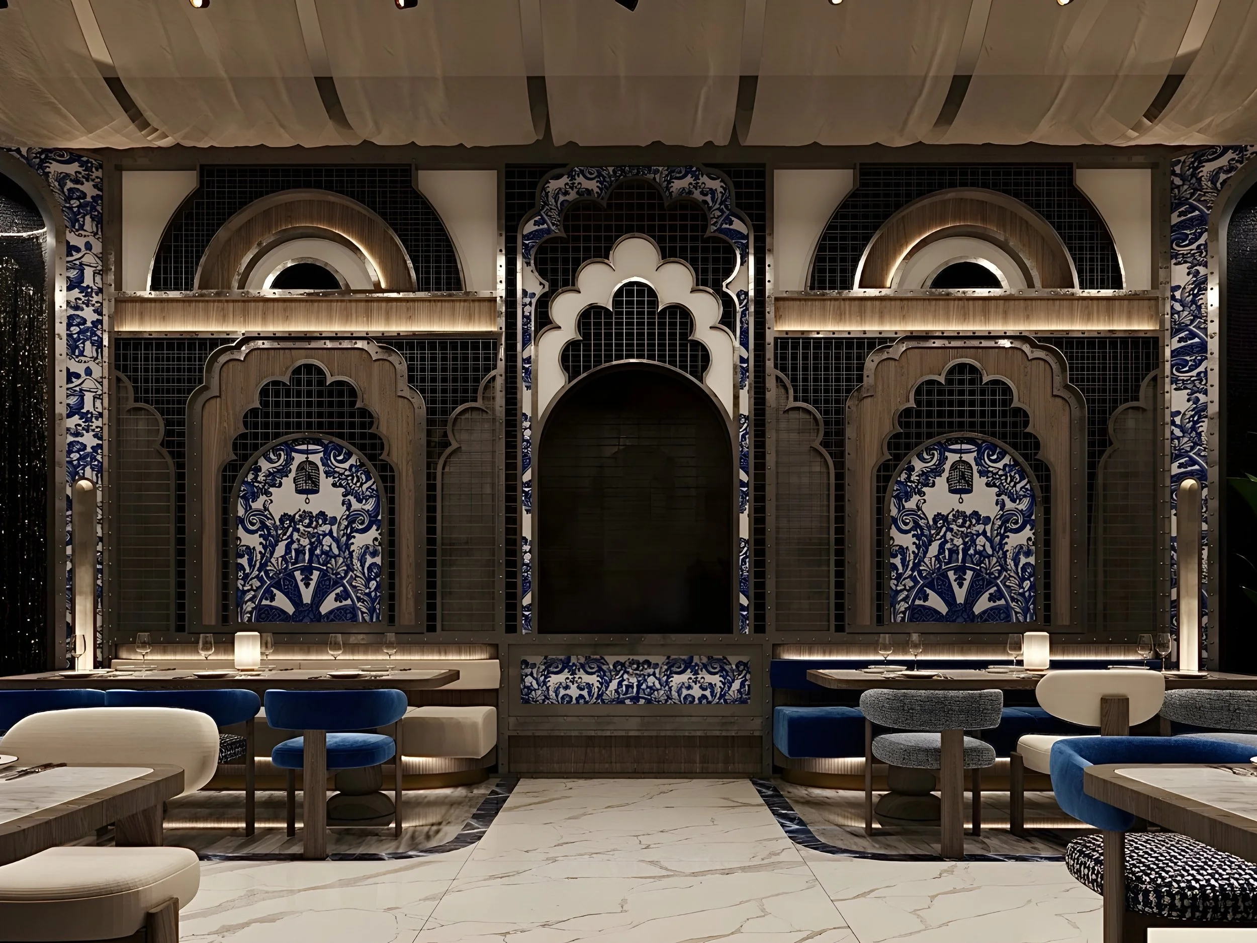 This space speaks to the coastal vernacular of the Eastern Mediterranean. Shades of blue and white reflect proximity to the sea, with soft textures and fabrics reinforcing an outdoor sensibility. The ceiling is composed of lightweight stretched textiles reminiscent of canopies or sailcloth draped loosely to simulate breeze and openness. The result is a space that feels relaxed, resort-like, and rooted in the architectural traditions of sun-drenched coastal cities.