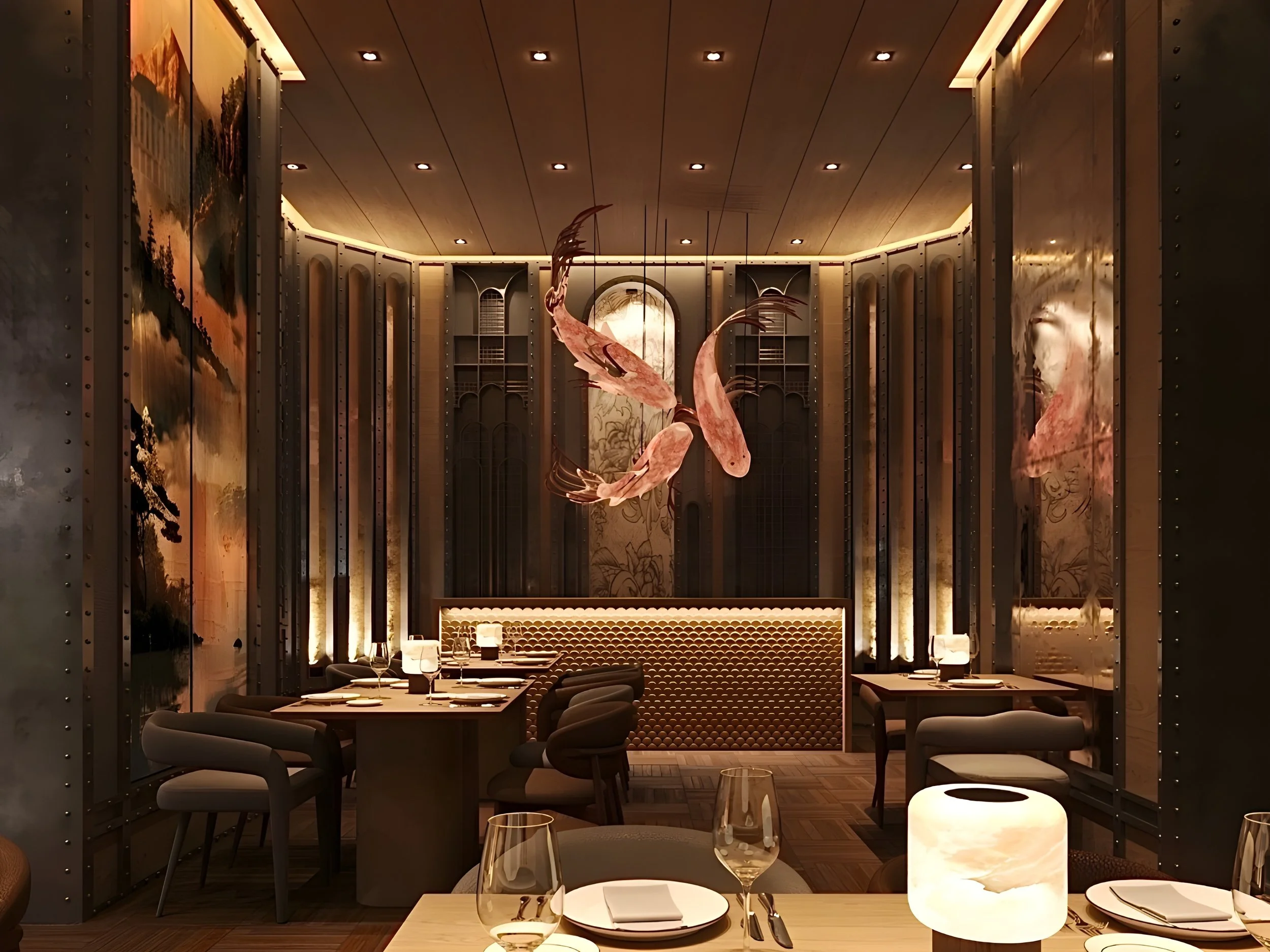In the Japanese space, calm precision meets tactile storytelling. A wooden sushi bar anchors the room, its surface formed from slatted timber that mimics the shimmering patterns of fish skin. Suspended above, a dramatic lighting sculpture of three koi fish floats in the air symbolising strength, luck, and movement. Wall finishes feature hand-painted elements and rich Japanese textiles, while the overall palette remains dark and grounding. Every element is intentional, creating a space for focused dining that is at once theatrical and serene.