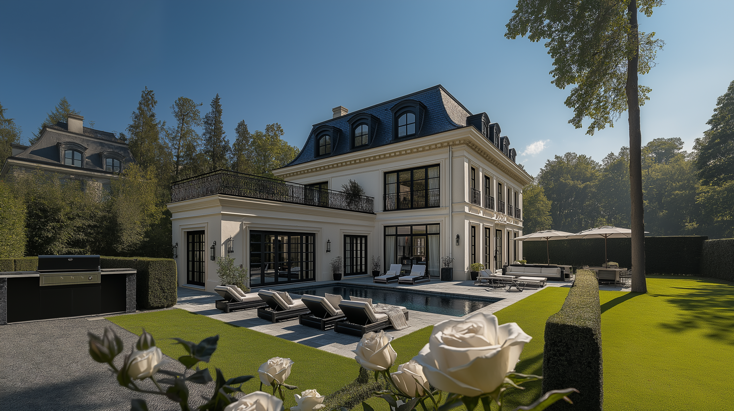 Outdoors, the rear garden offers a peaceful contrast to the home’s formality. Lush hedges, symmetrical layouts, and a crisp pool define the space, softened by pale sunbeds and white floral arrangements. Lounge areas are designed for leisure and calm, shaded by umbrellas and surrounded by precise landscaping. This is an outdoor living experience that mirrors the purity of the architecture itself clean, balanced, and deeply private.