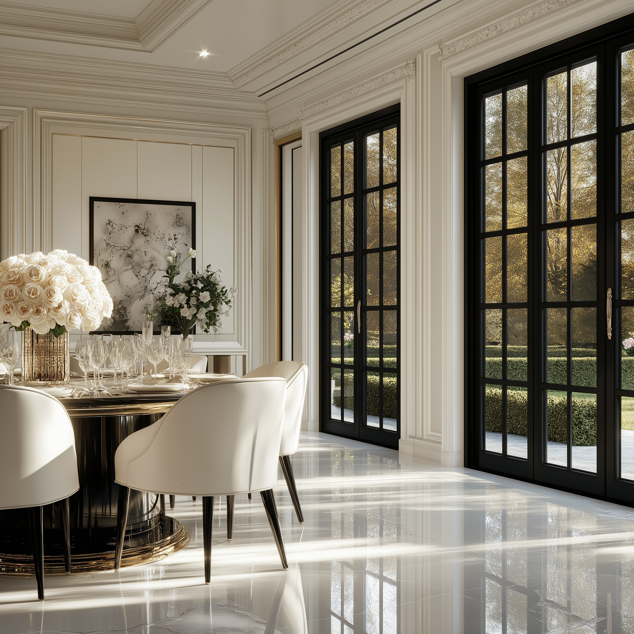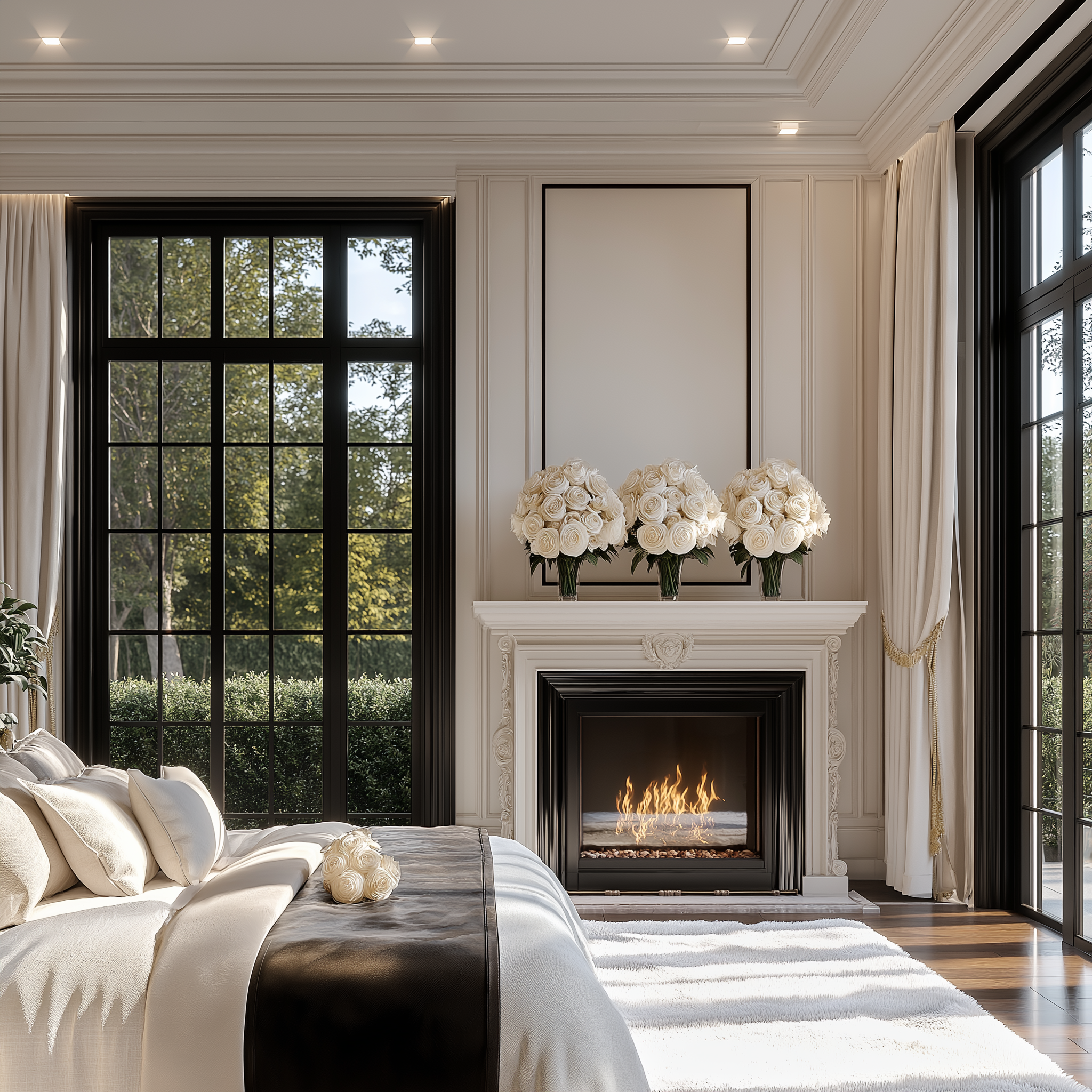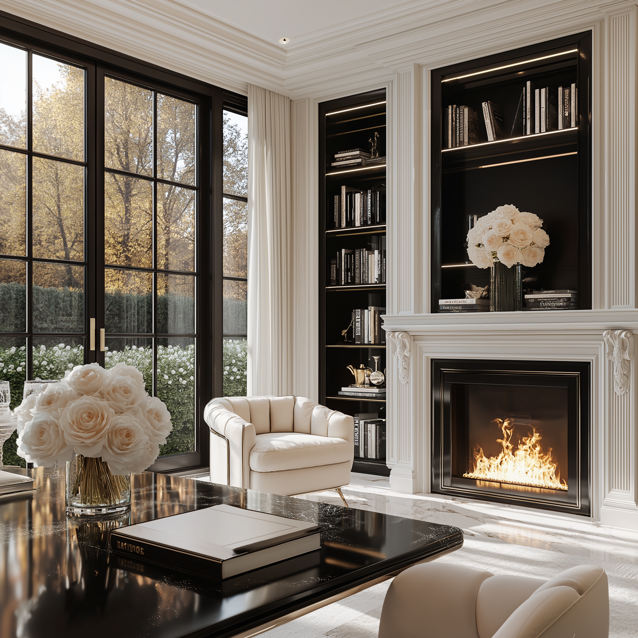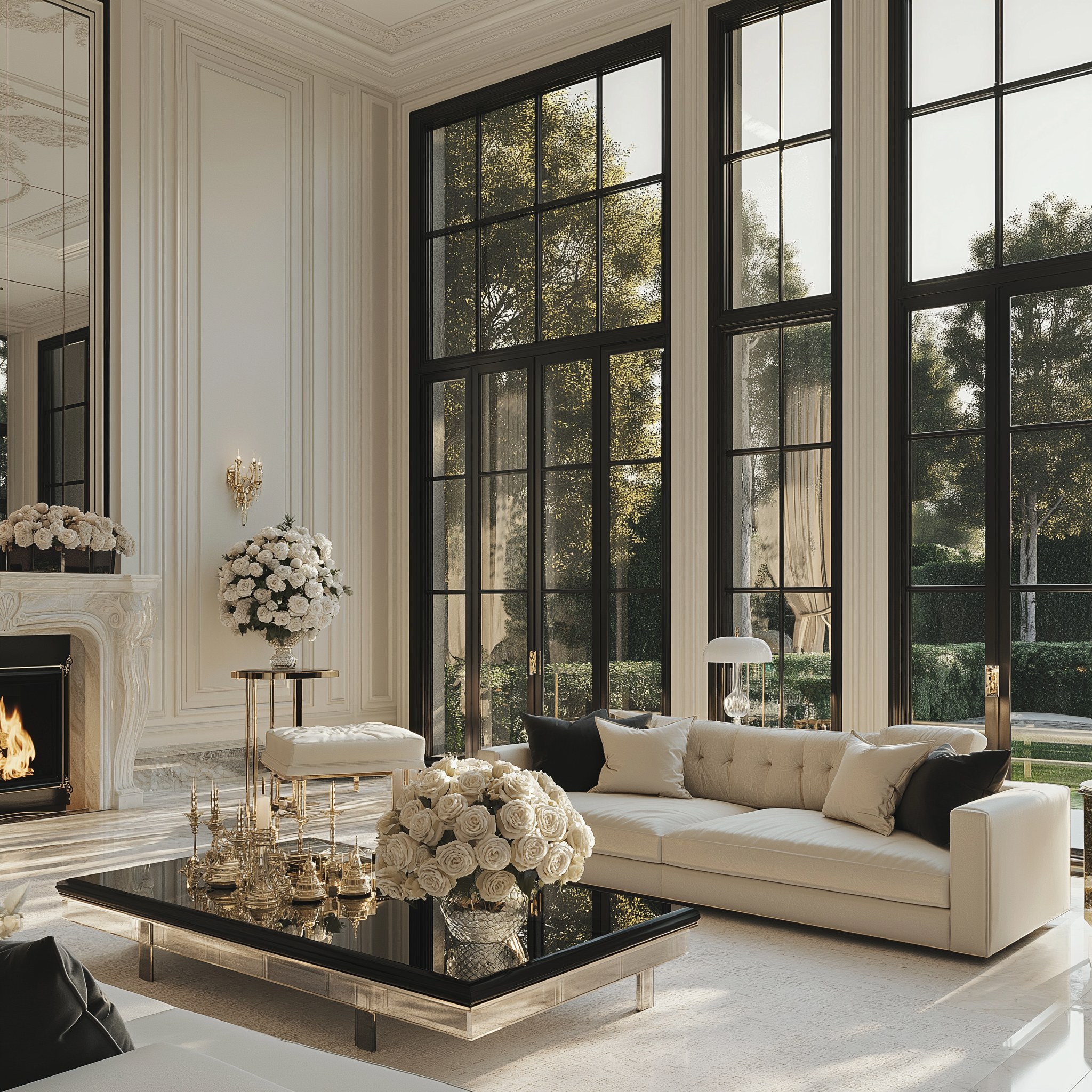 The main living space is grand yet welcoming, where tall black-framed windows allow natural light to flood in, dancing across soft ivory furnishings and polished marble. The symmetry of the fireplace wall and the styling of floral arrangements create an atmosphere that feels both serene and formal. Every corner is considered, with neutral textures layered to provide depth without distraction an intentional canvas of elegance.