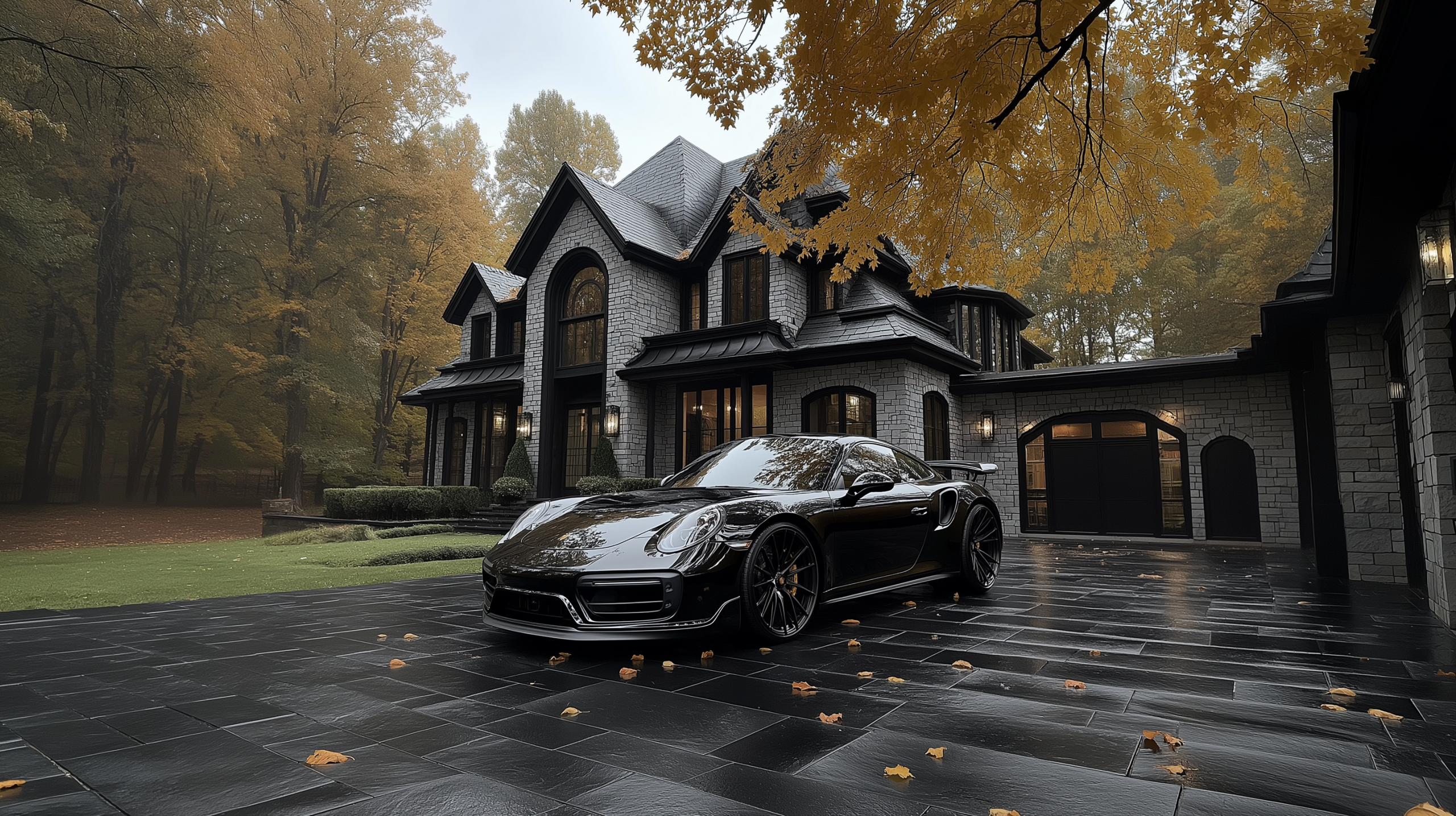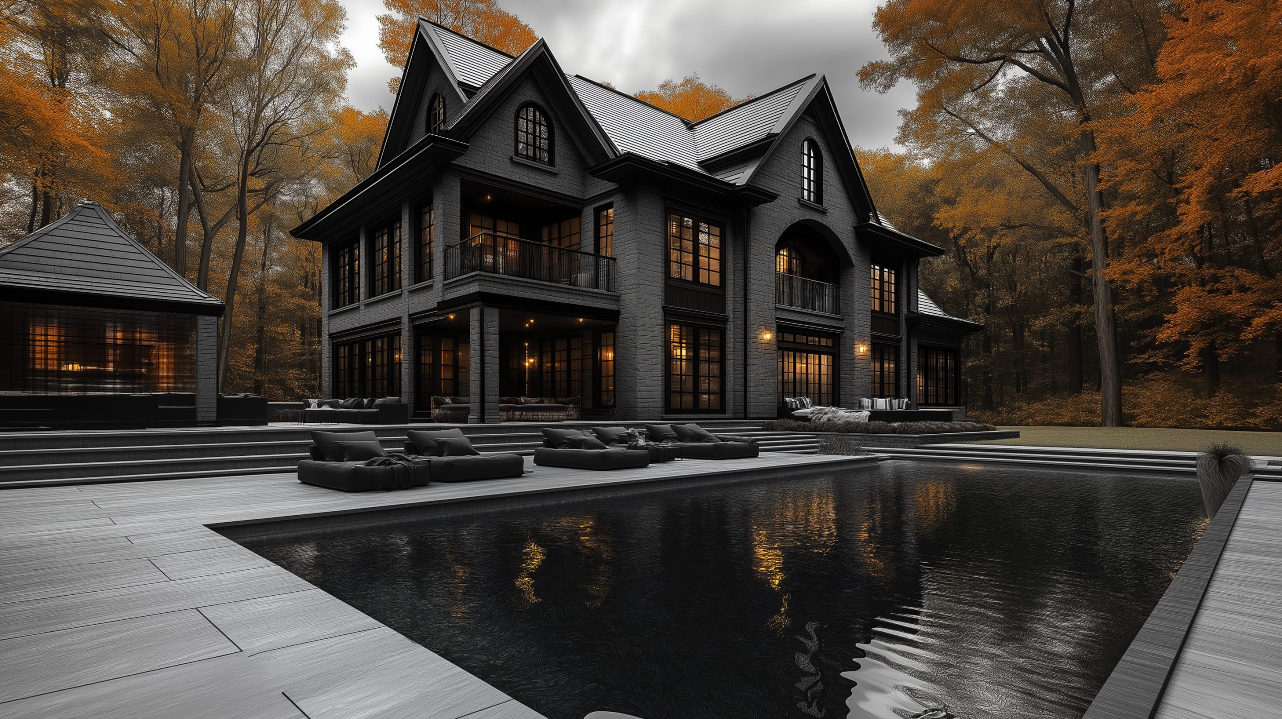 Tucked within a golden-hued forest in Nashville, Tennessee,The Shadowfall Estate is a conceptual residential project that redefines elegance with a moody twist. The architecture embraces a deeper tonal palette charcoal stone, matte black trims, and slate roofing all chosen to evoke a sense of stillness and serenity. From the moment you approach the house, the bold façade, paired with reflective stone paving and a sleek black sports car, creates a powerful first impression that balances strength with subtlety.