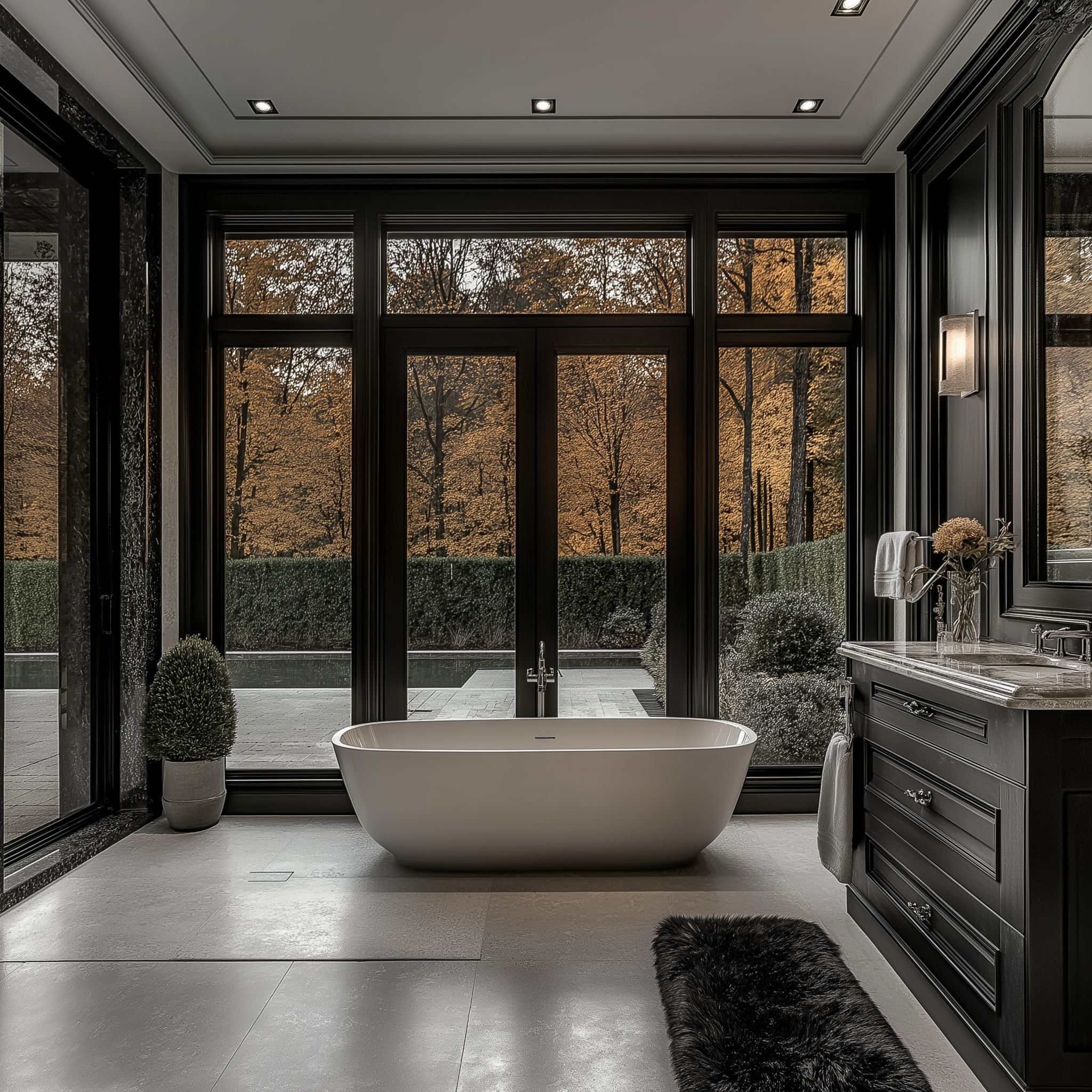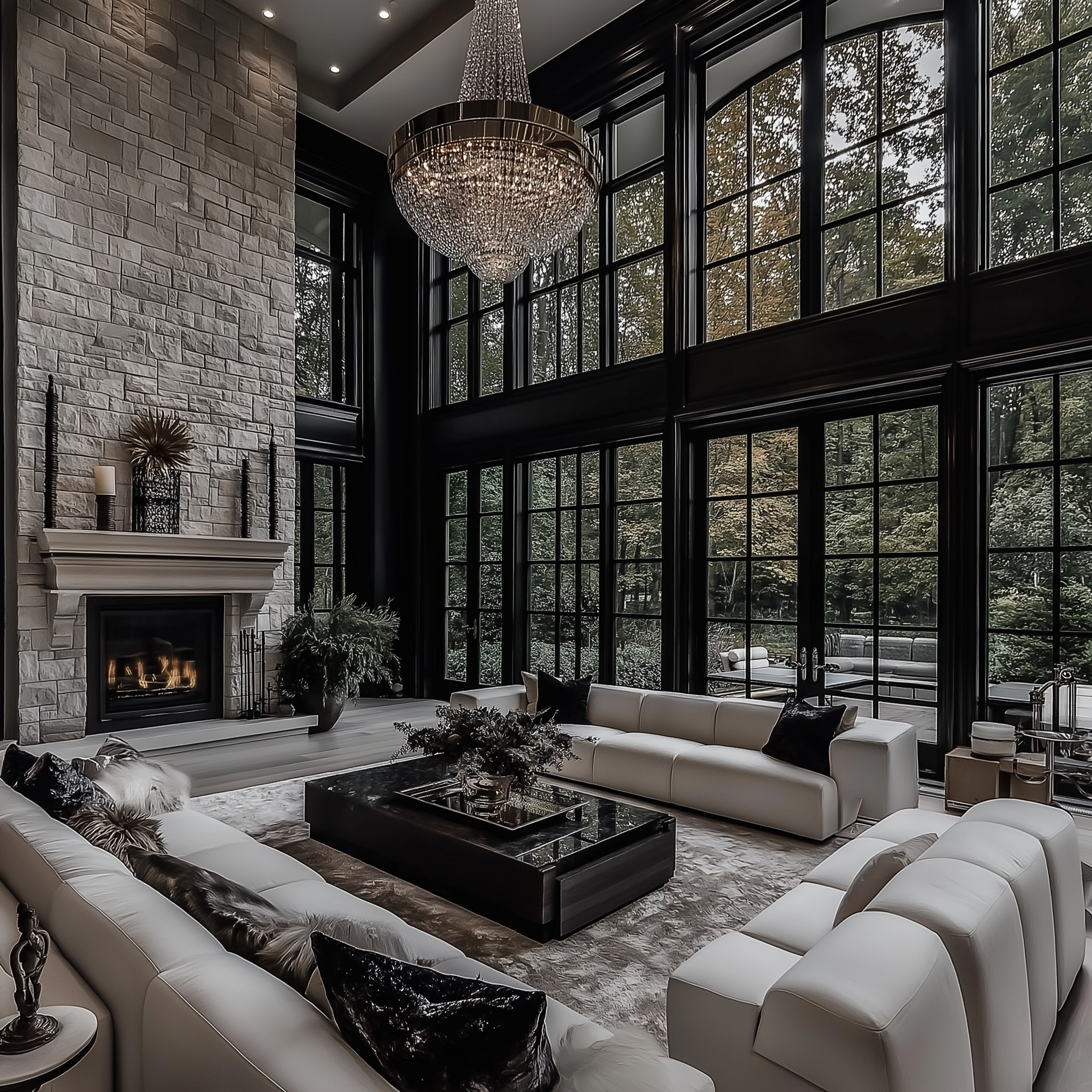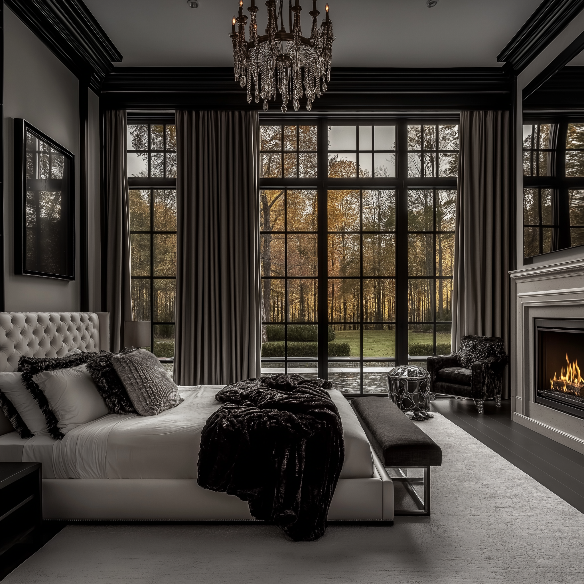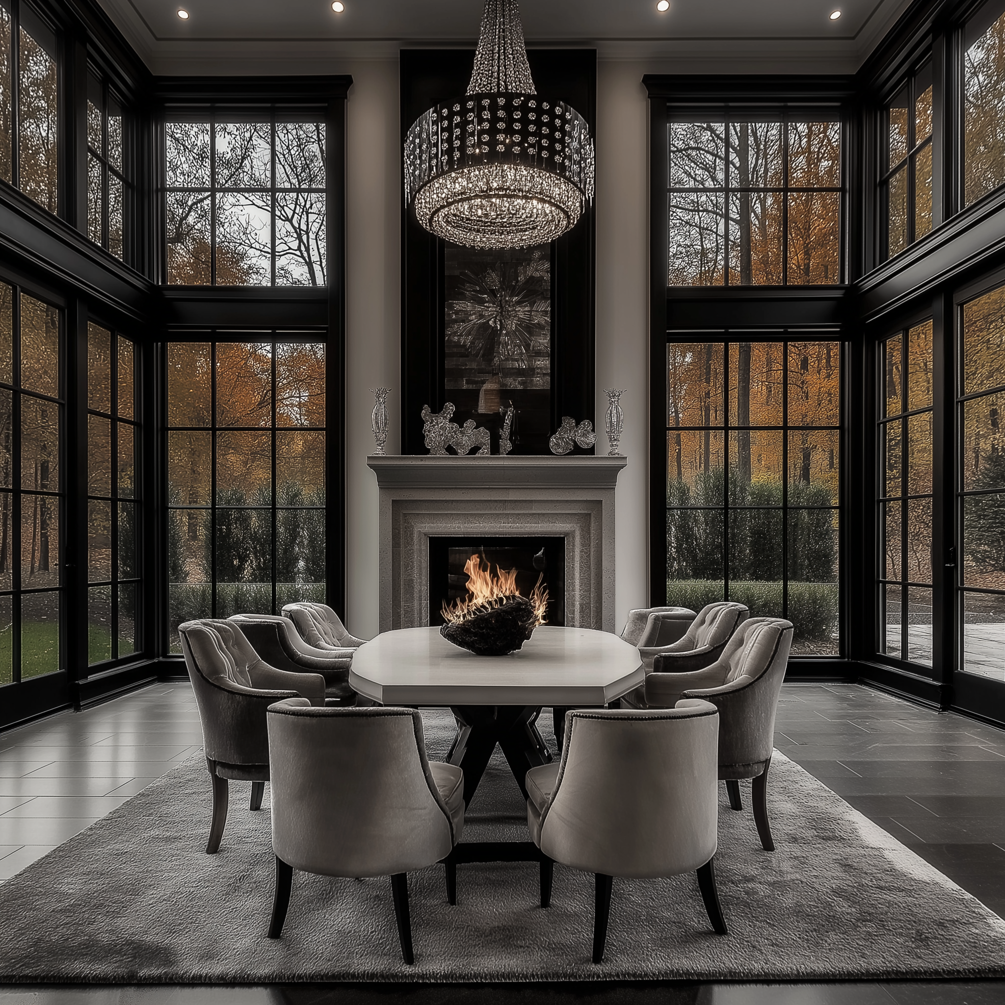 The dining room is the heart of the home’s atmosphere. Designed as an intimate yet dramatic setting, the tall black-framed windows allow soft autumn light to pour in, illuminating a sculptural chandelier that hovers above a central fire pit dining table. The textures are plush, the tones neutral, and the space is framed by symmetry and softness. The flickering fire becomes the emotional core of the room, reinforcing the home’s intention: to feel grounded and cozy, even within grand scale.