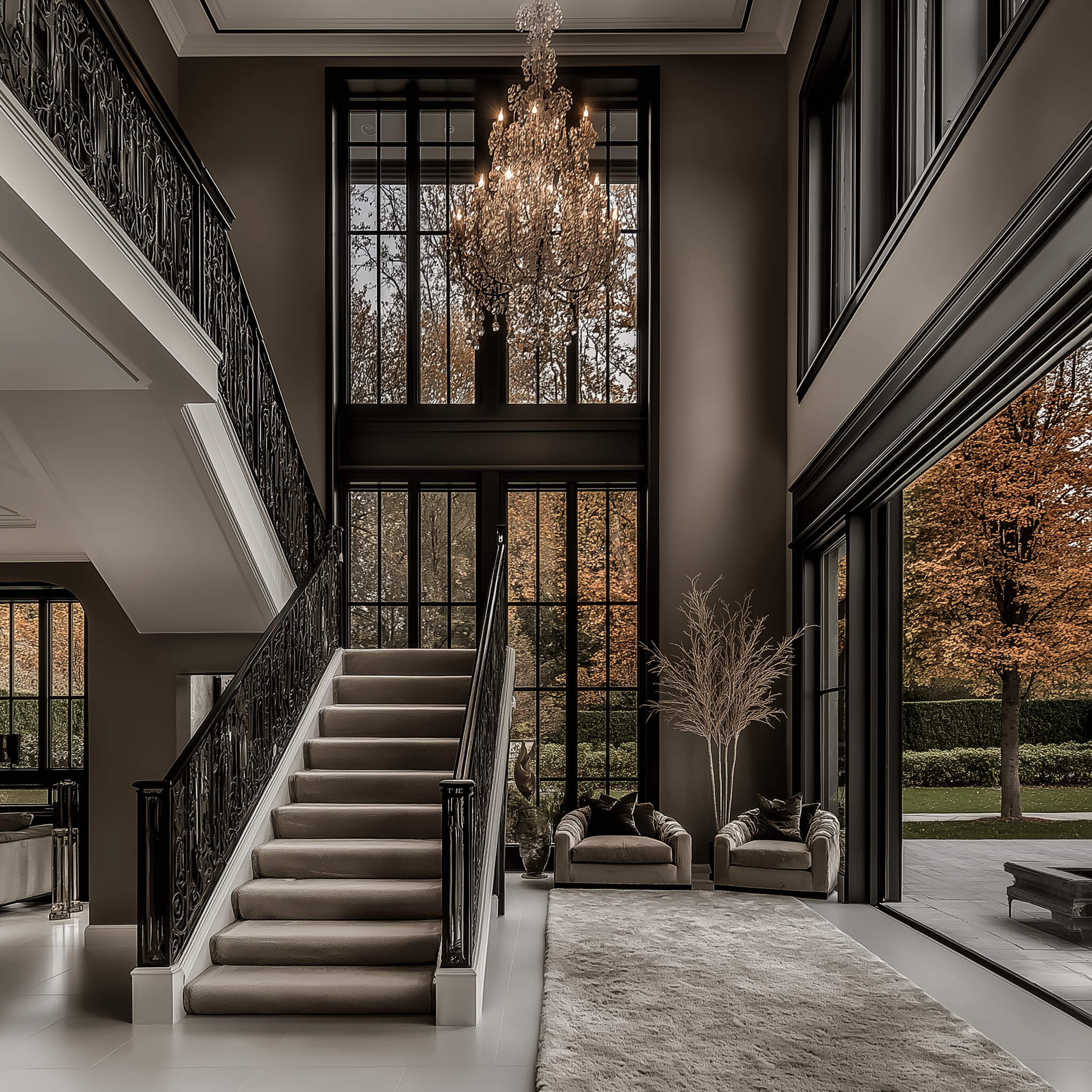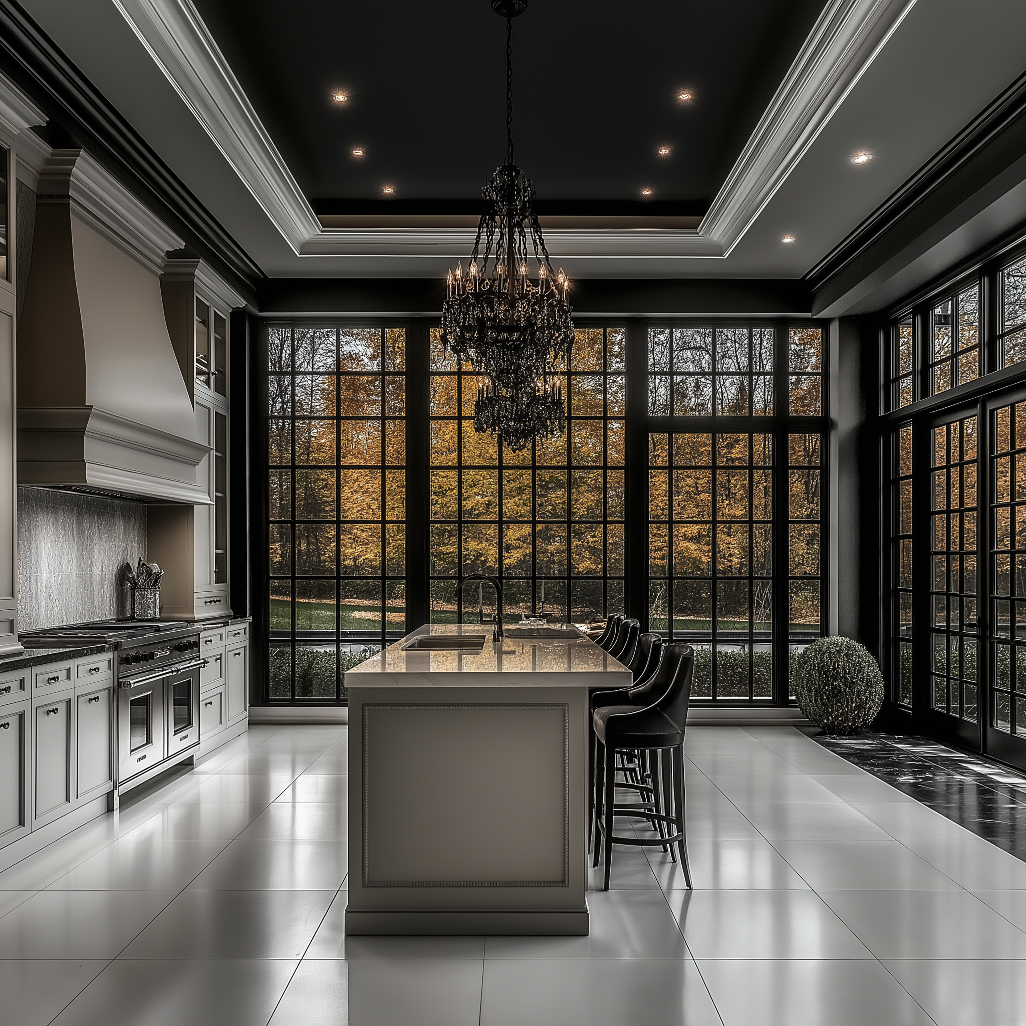 The kitchen and stairwell area combine formality with functionality. The sweeping staircase curves gently through the double-height space, while wrought-iron balustrades add a sense of old-world detail. In contrast, the kitchen is sharp and polished: monochrome cabinetry, twin chandeliers, and a bold island layout that makes entertaining feel theatrical. The juxtaposition of ornamental and contemporary is deliberate it’s a blend of timeless form and modern flair.