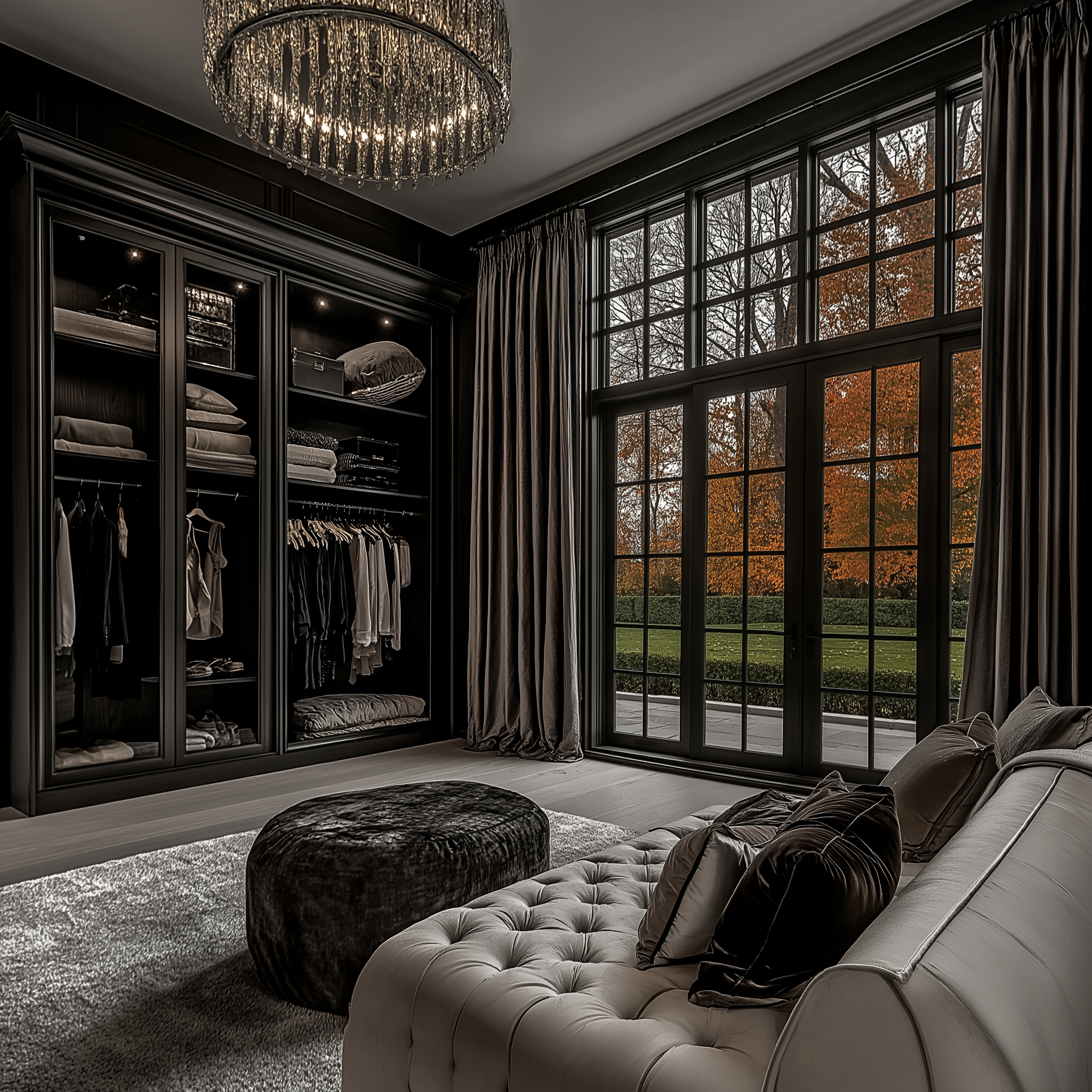 The private spaces carry the same material richness in a more intimate setting. The master bedroom is cocooned in layered textiles and draped in neutral elegance, with direct views to the forest beyond. The walk-in wardrobe and en-suite continue the home’s design language black trim, soft flooring, crystal lighting. Every small space in the home was considered with care, ensuring continuity and refinement at every scale.