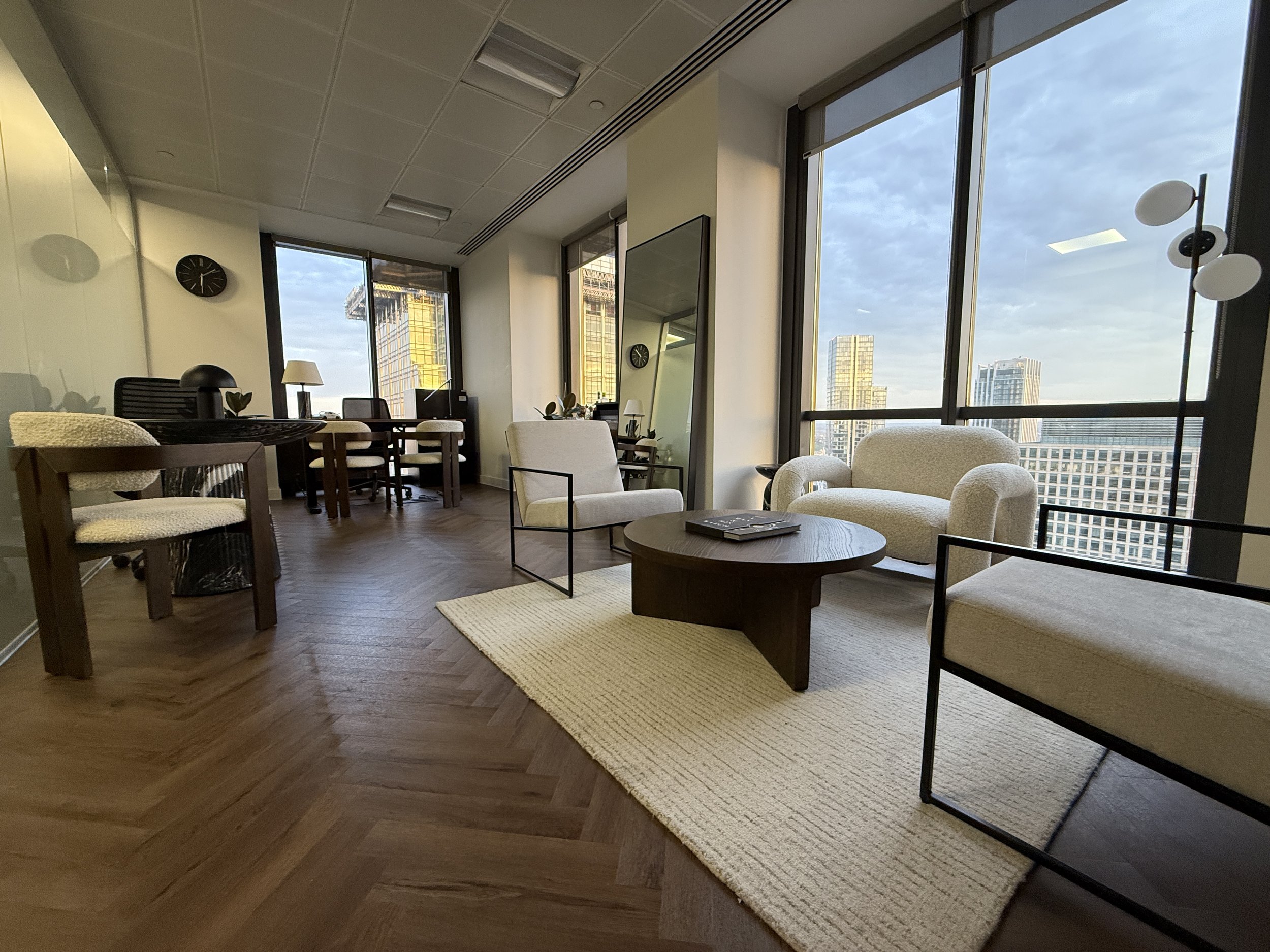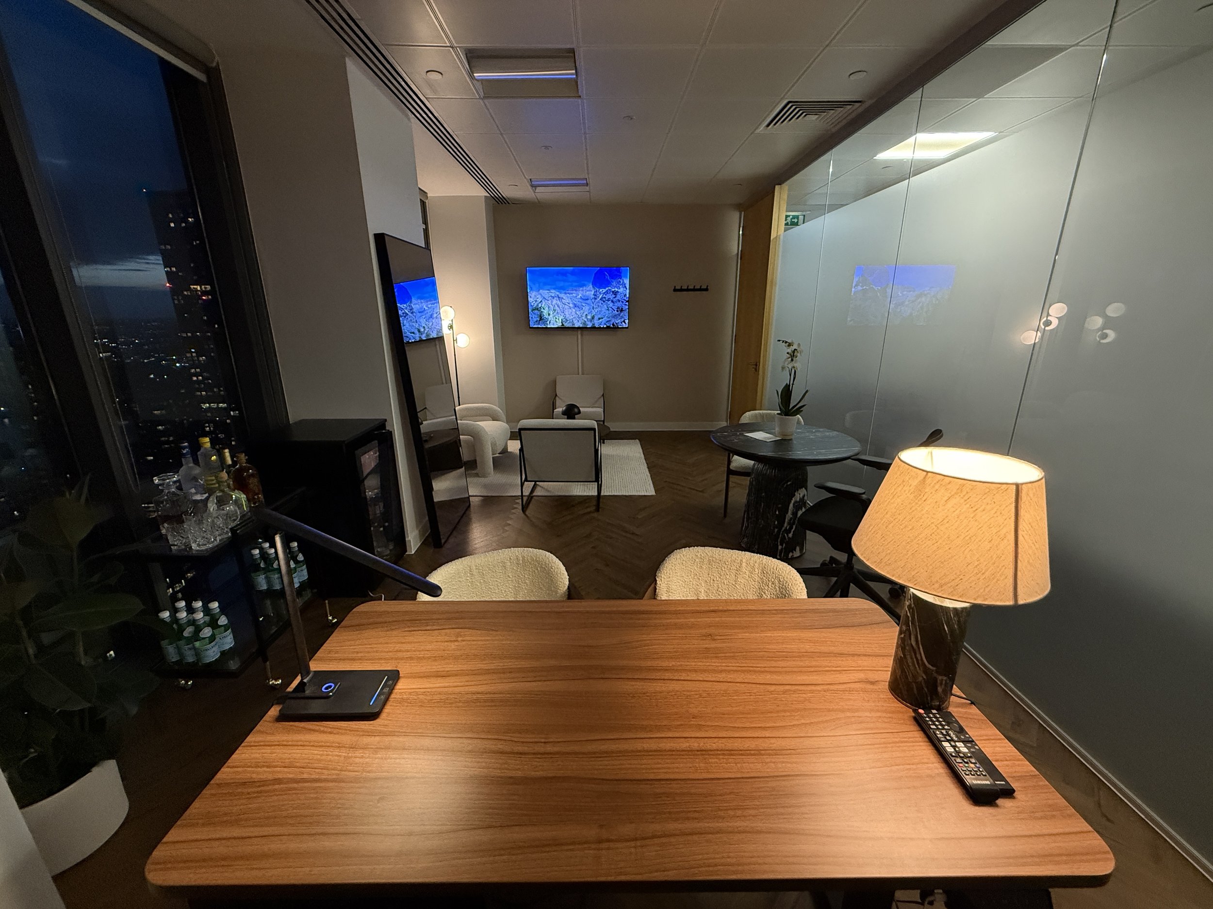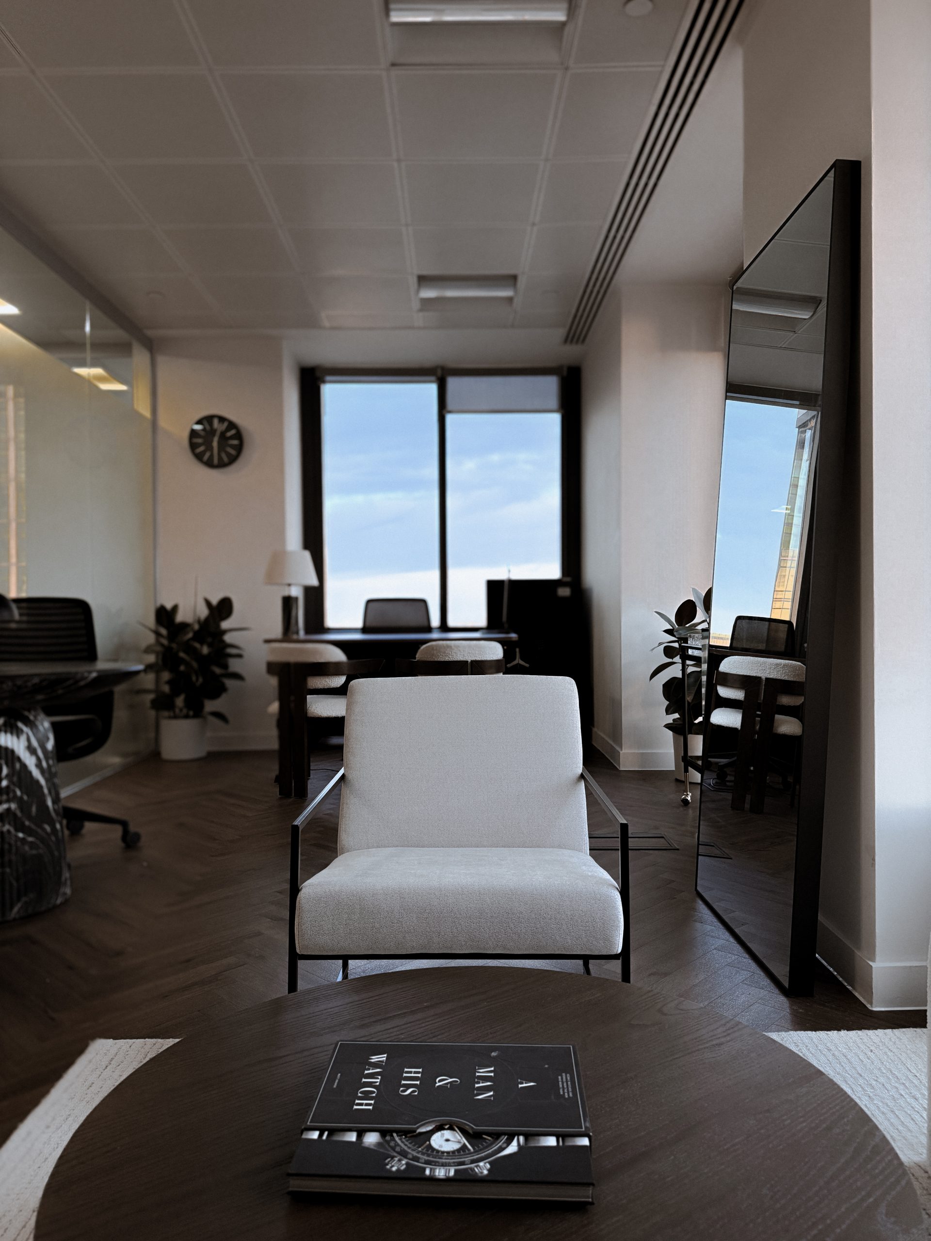 Located on the 37th floor of One Canada Square in Canary Wharf, this 40 m² office project redefines what a consultation space can be. Originally a stark white industrial shell, the interior has been transformed into a refined, softly lit lounge tailored for private viewings of high-end watches including Patek Philippe and Rolex. The client experience begins the moment they walk in: this isn’t an office, it’s a sanctuary of craftsmanship. Taking cues from the iconic AP House, the design leans into rich wood finishes, warm neutral tones, and subtle detailing creating an atmosphere that is calm, elevated, and entirely discreet.