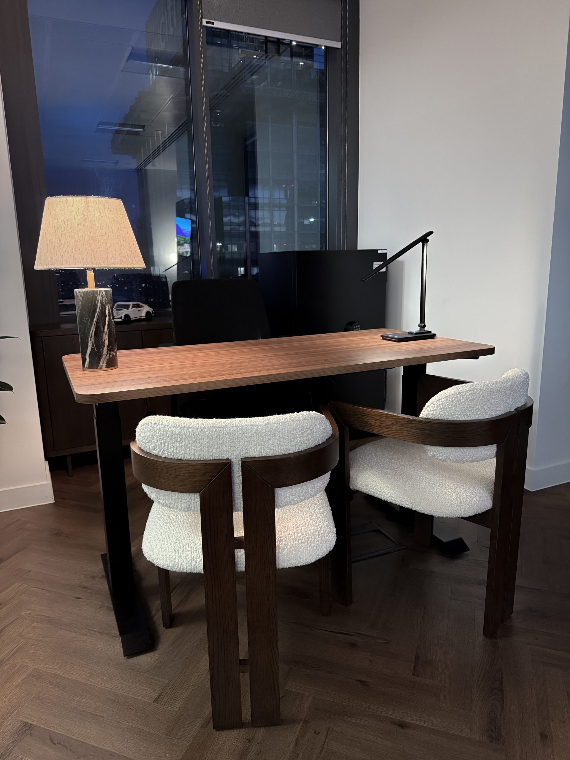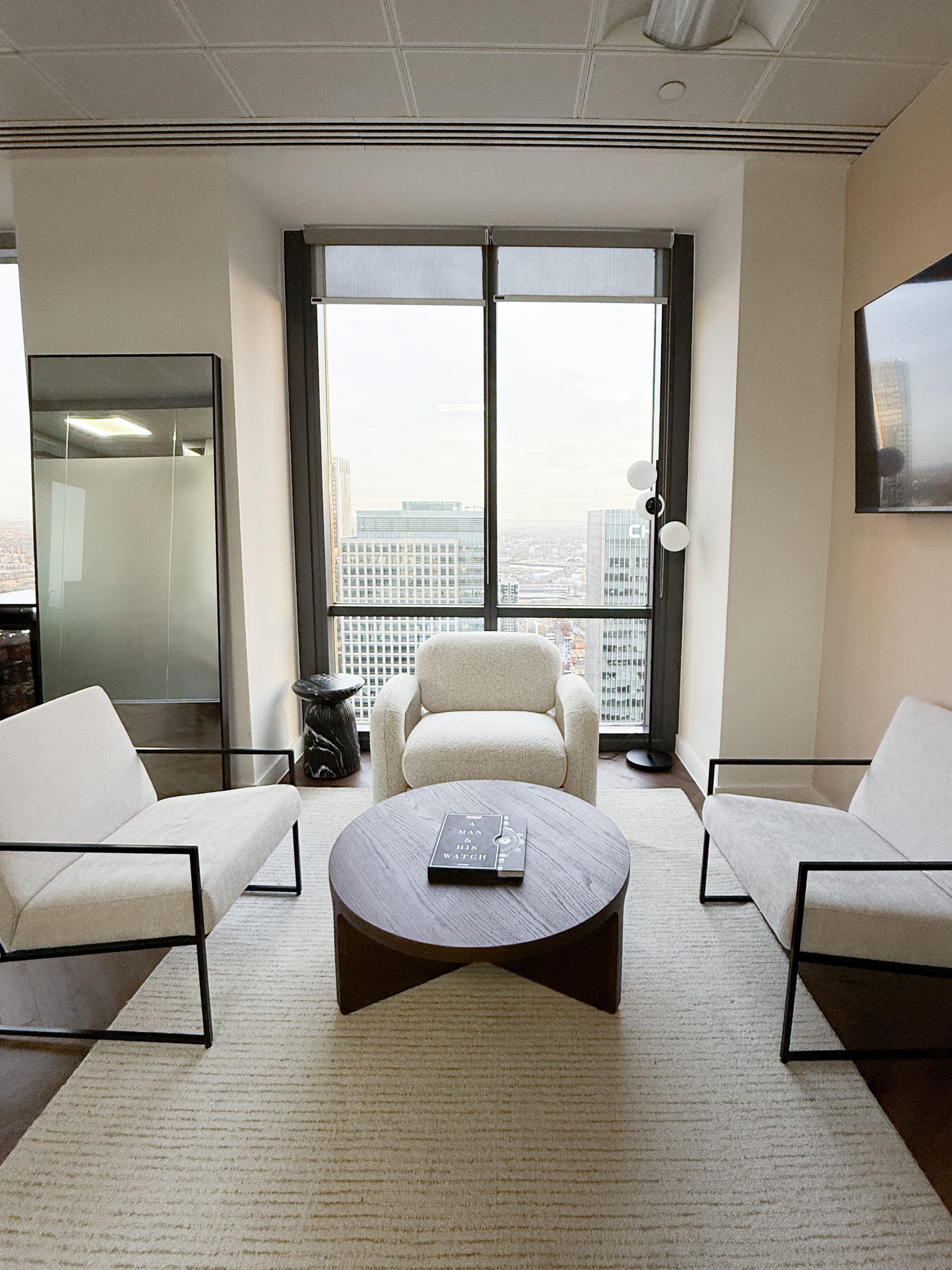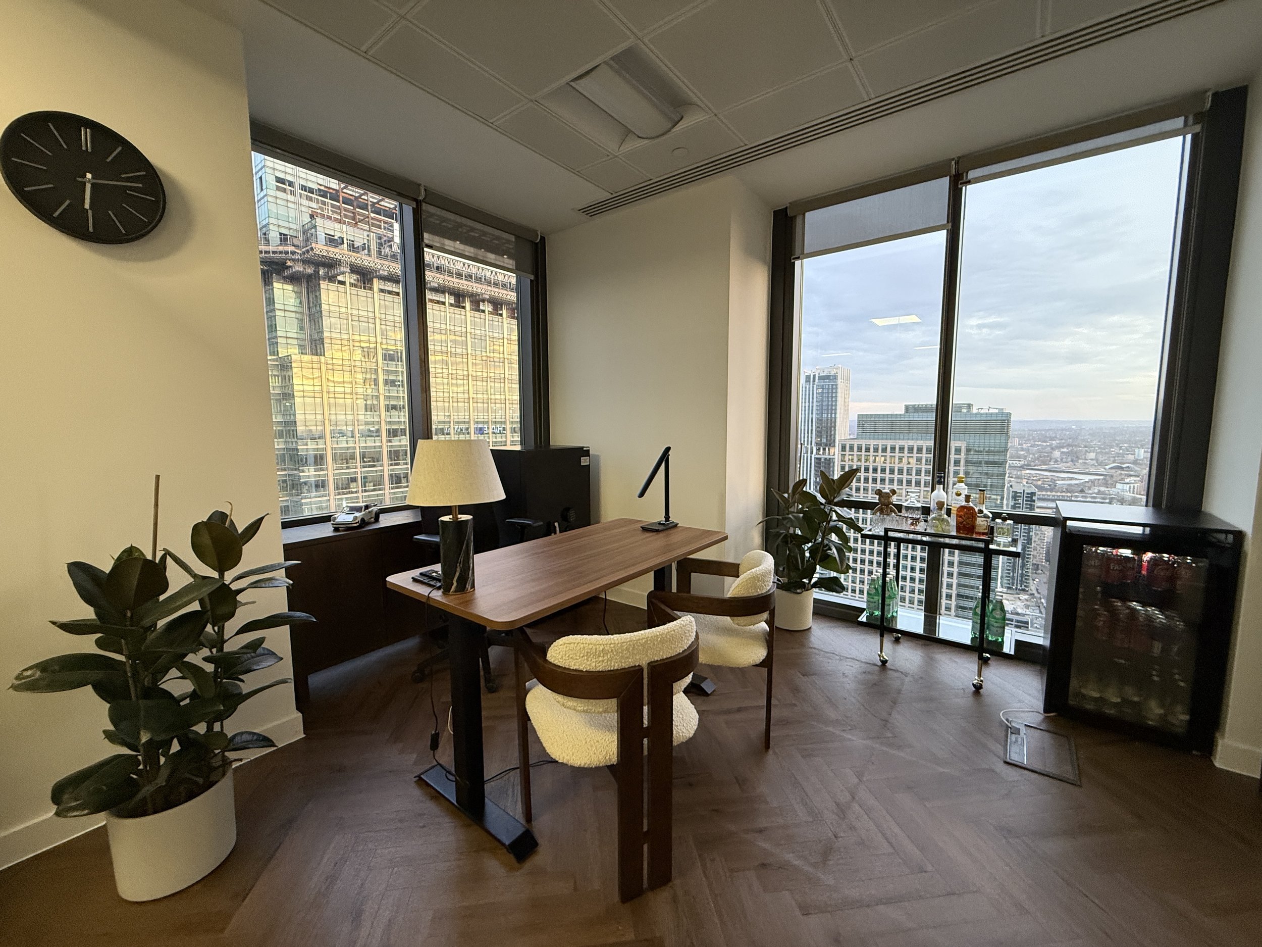 Located on the 37th floor of One Canada Square in Canary Wharf, this 40 m² office project redefines what a consultation space can be. Originally a stark white industrial shell, the interior has been transformed into a refined, softly lit lounge tailored for private viewings of high-end watches including Patek Philippe and Rolex. The client experience begins the moment they walk in: this isn’t an office, it’s a sanctuary of craftsmanship. Taking cues from the iconic AP House, the design leans into rich wood finishes, warm neutral tones, and subtle detailing creating an atmosphere that is calm, elevated, and entirely discreet.