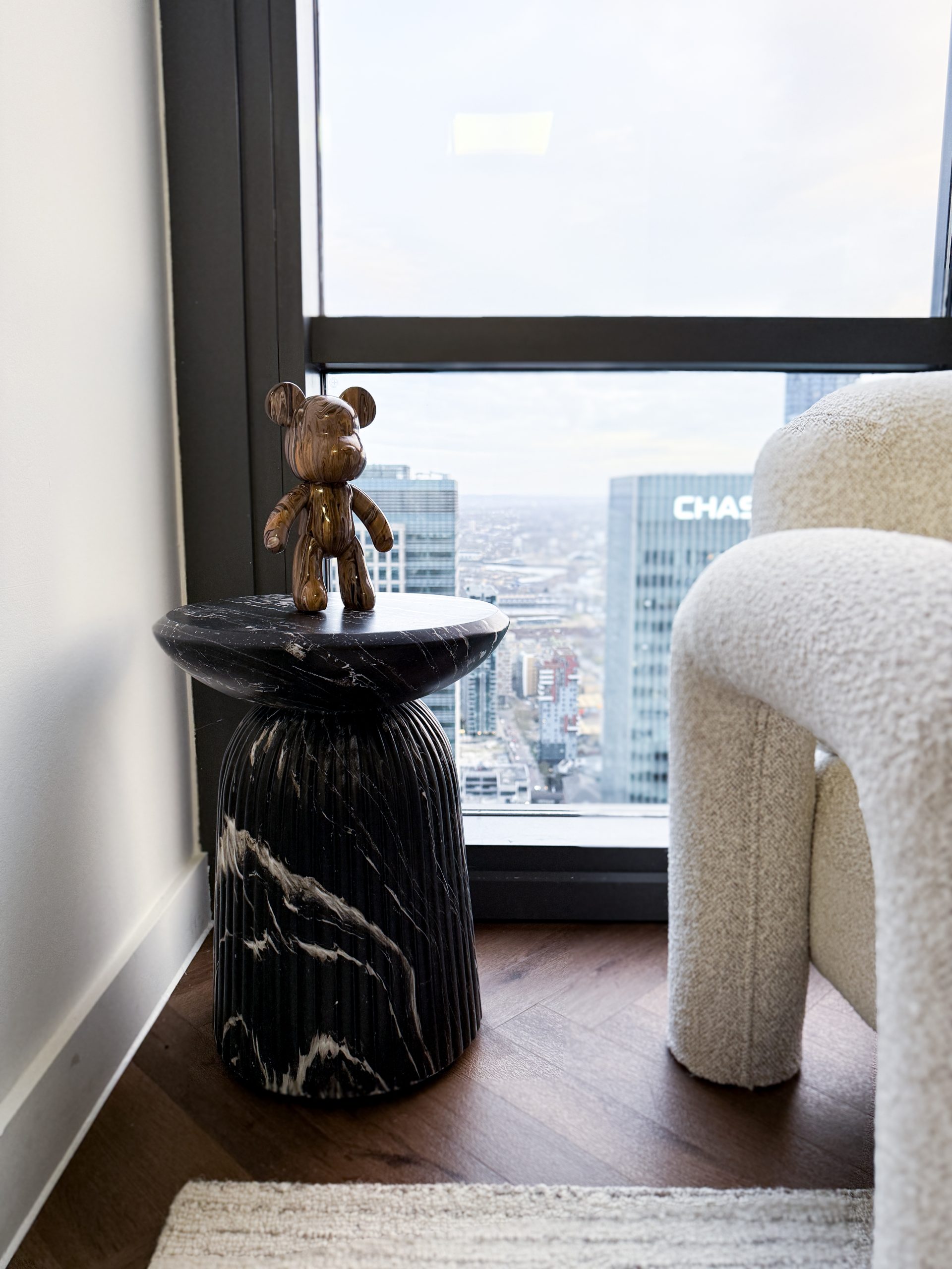 Every surface has been curated for harmony. Flanking the plush armchair is a petite marble side table, crafted from the same stone and by the same brand as the larger informal coffee table nearby. The intent was not just aesthetic continuity, but material storytelling bringing together distinct furniture elements into a single language of texture and tone. These dual tables, though different in scale, offer subtle functionality while reinforcing the spatial rhythm.
