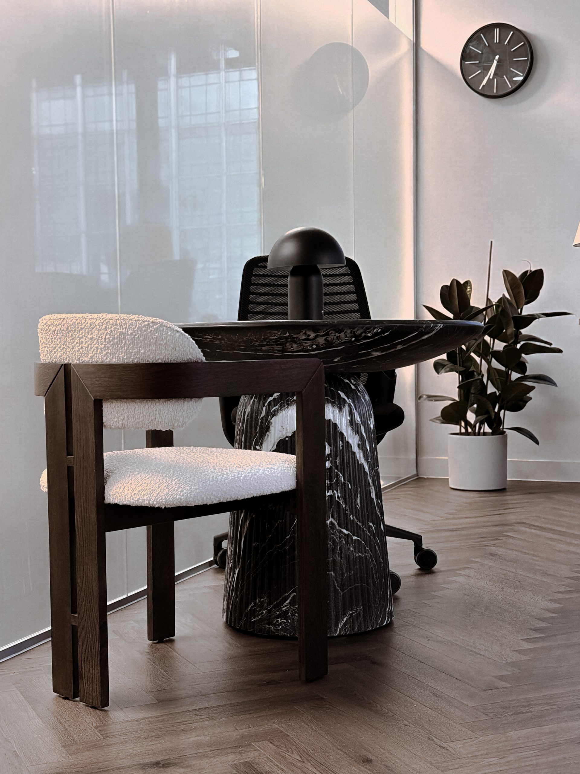 To complete the lounge, two matching armchairs are placed facing one another across a circular wooden coffee table. This symmetry offers a natural gathering zone for informal conversations or quiet reflection while the client explores the watch selection. Materials were chosen to enhance tactility soft fabrics, curved timber, and stone all reinforcing the lounge’s balance between elegance and intimacy.